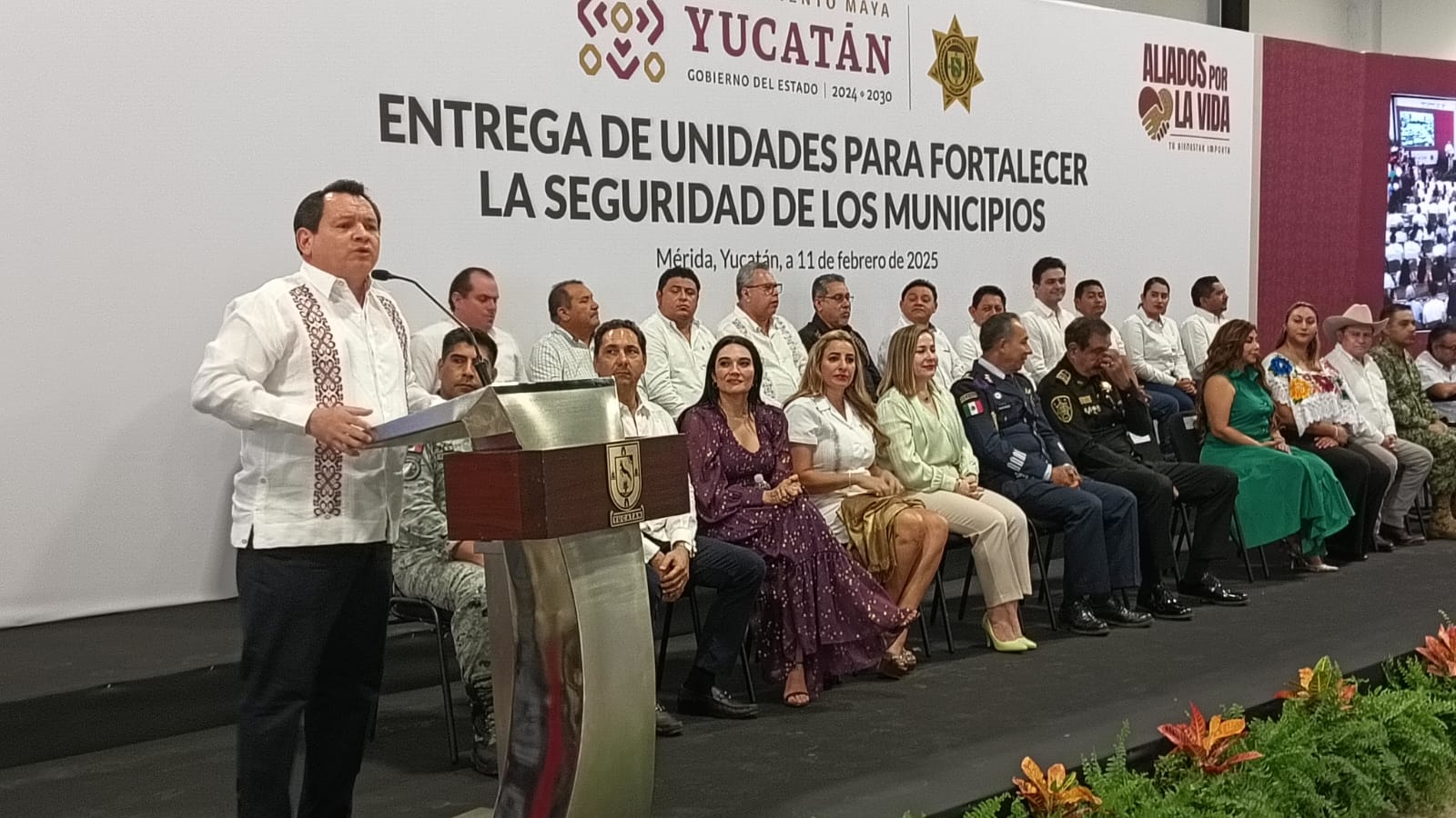 Acompañado de la presidenta honoraria del DIF Yucatán, la maestra Wendy Méndez Naal, y del titular de la Secretaría de Seguridad Pública (SSP), Luis Felipe Saidén Ojeda, el gobernador destacó que hoy es un día significativo por la entrega de 169 unidades completamente equipadas que contribuyen a fortalecer el parque vehicular de las policías municipales, permitiendo mejorar sus capacidades operativas y, sobre todo, la protección de sus habitantes.