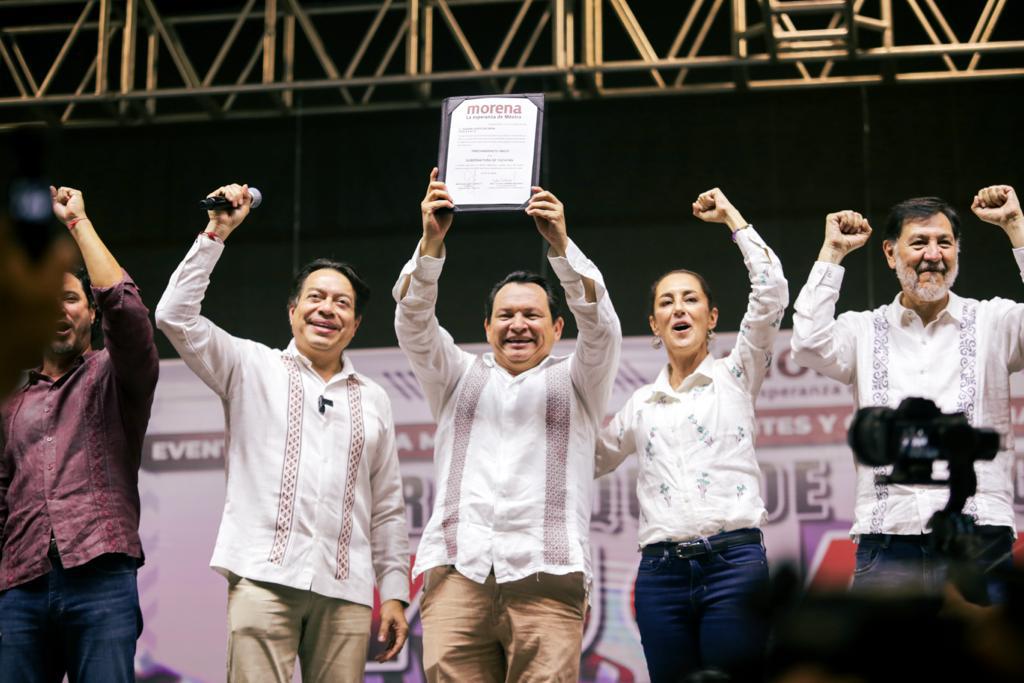 Verónica Camino Farjat, Alpha Tavera Escalante, Jéssica Saidén Quiroz, Rocío Barrera Puc y Raúl Paz Alonzo; los dirigentes estatales del PVEM, Harry Rodríguez Botello; PT, Francisco Rosas Villavicencio, y Morena, Omar Pérez Avilés, secretario general en funciones de presidente, así como Gerardo Fernández Noroña, vocero de la Dra. Sheinbaum.
