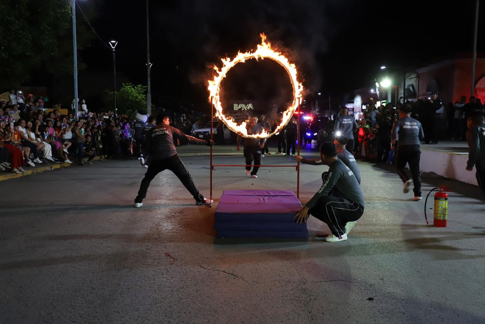 Elementos de la Policía Municipal de Kanasín realizaron también demostraciones de destreza brincando aros de fuego encendidos.