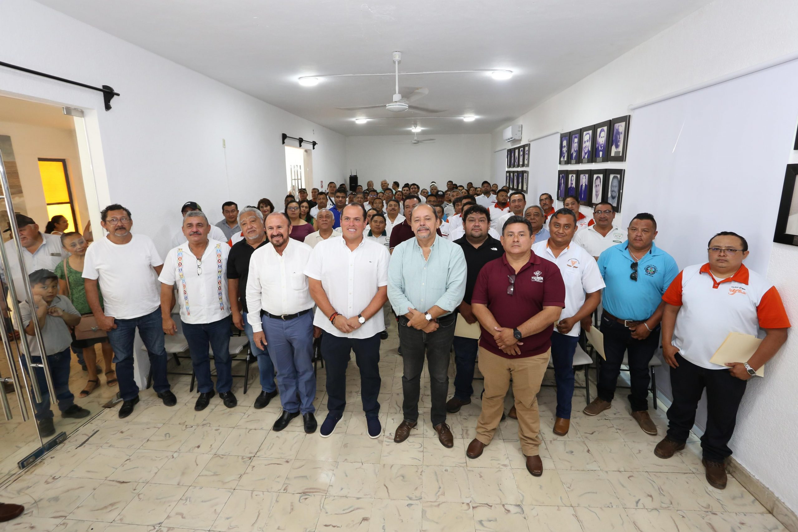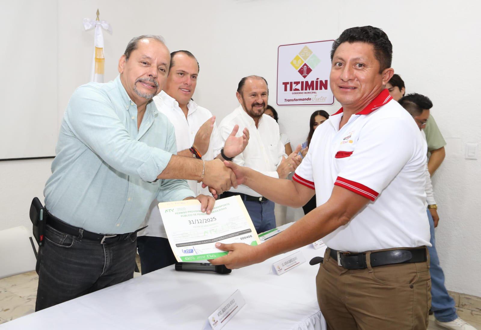 Acompañado del alcalde anfitrión, Adrián Quiroz Osorio y el director de transporte de la ATY, Marco Antonio González Canto, Sosa Novelo realizó la entrega de permisos de circulación que permitirán a las organizaciones brindar servicio en el marco regulatorio con el compromiso de encaminarse a la modernización del transporte.