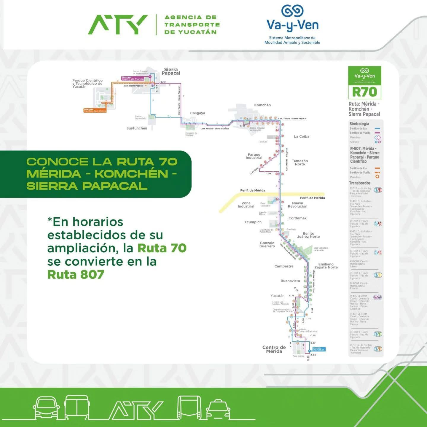 La Ruta 807, ampliación de la Ruta 70, conectará el Centro de Mérida con el Parque Científico Tecnológico de Yucatán. Su operación se realizará de lunes a viernes. Los viajes del Centro al Parque Científico saldrán a las 6:30, 7:30, 13:30 y 14:30 horas; mientras que del Parque Científico al Centro los horarios de salida serán a las 8:00, 9:00, 15:00 y 16:00 horas.