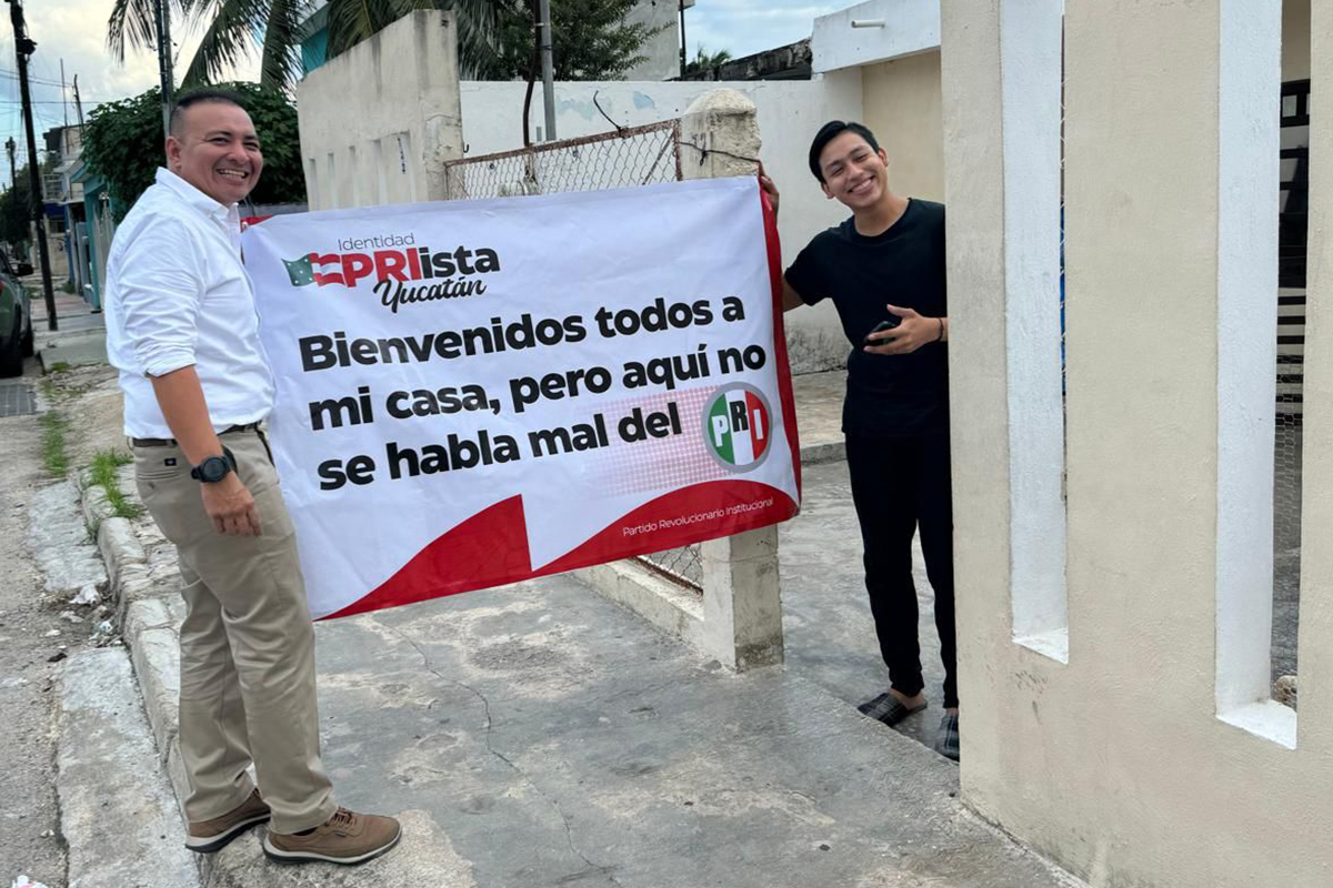 El responsable del Programa Identidad Priísta, Sergio Vadillo Lora, recorre predios de agremiados al tricolor ofreciendo mantas con textos defendiendo a su partido.