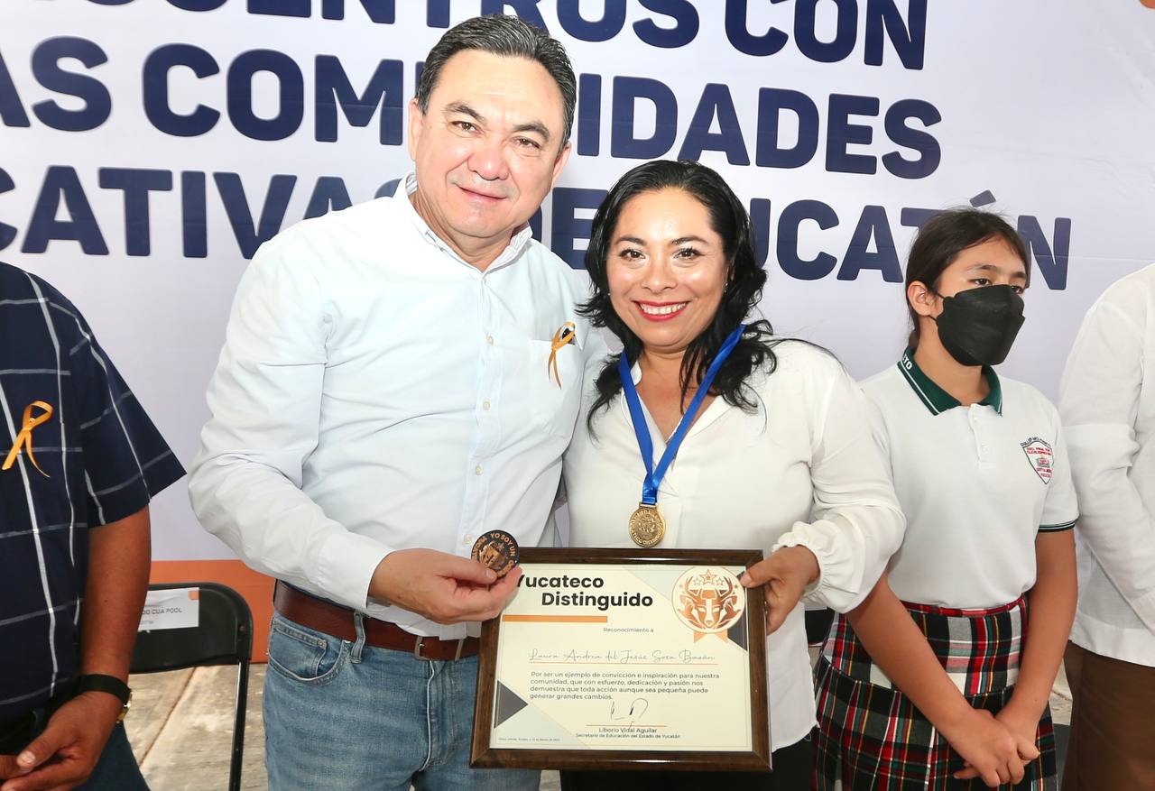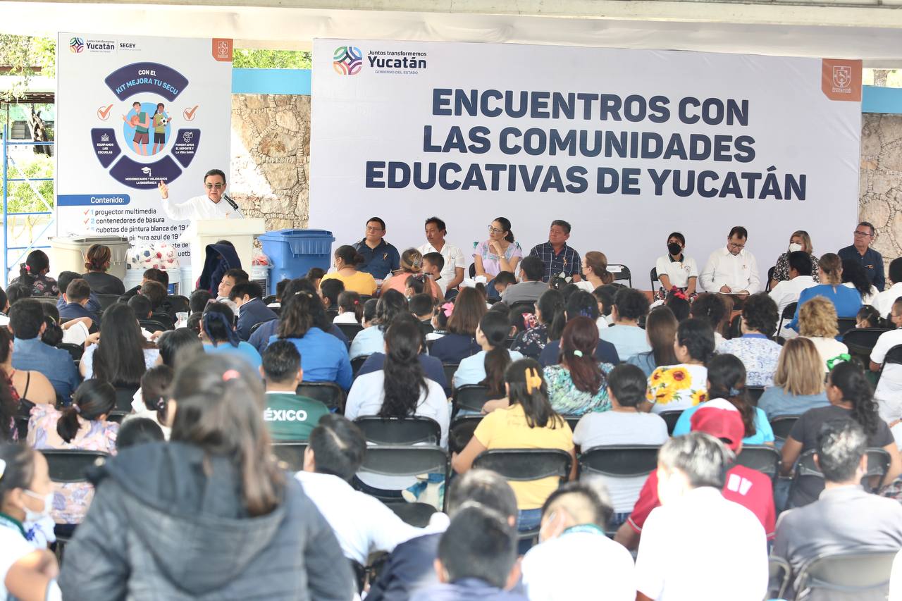 Para continuar con el fortalecimiento del servicio educativo en las escuelas de las cabeceras municipales y comisarías, el titular de la Secretaría de Educación del Gobierno del Estado de Yucatán, Liborio Vidal Aguilar entregó en gira de trabajo, mobiliario escolar, kits del programa “Mejora tu Secu” y especies endémicas de la estrategia estatal “Un niño, un árbol”.Acompañaron al funcionario los comisarios José Carlos Cuá Pool y Juan Pablo Noh Euán, de Dzityá y Caucel respectivamente; autoridades educativas, escolares, líderes sindicales de trabajadores de la educación, docentes, estudiantes y madres y padres de familia.“En este tiempo como secretario, lo principal que he aprendido es a escuchar, para entender y atender las necesidades de nuestras comunidades educativas, que son lo más preciado de la sociedad porque son las mujeres y hombres de mañana que seguirán transformando Yucatán, fomentando los valores que caracterizan a la entidad, cómo el respeto, la cultura del trabajo bien hecho, de la paz y la igualdad para que todas y todos prosperen. Seguiremos visitando las escuelas para continuar escuchando de viva voz lo que se requiere para que la educación en Yucatán siga siendo equitativa y de calidad en todos los municipios y sus comisarías”, dijo en su mensaje, el titular de la Segey.