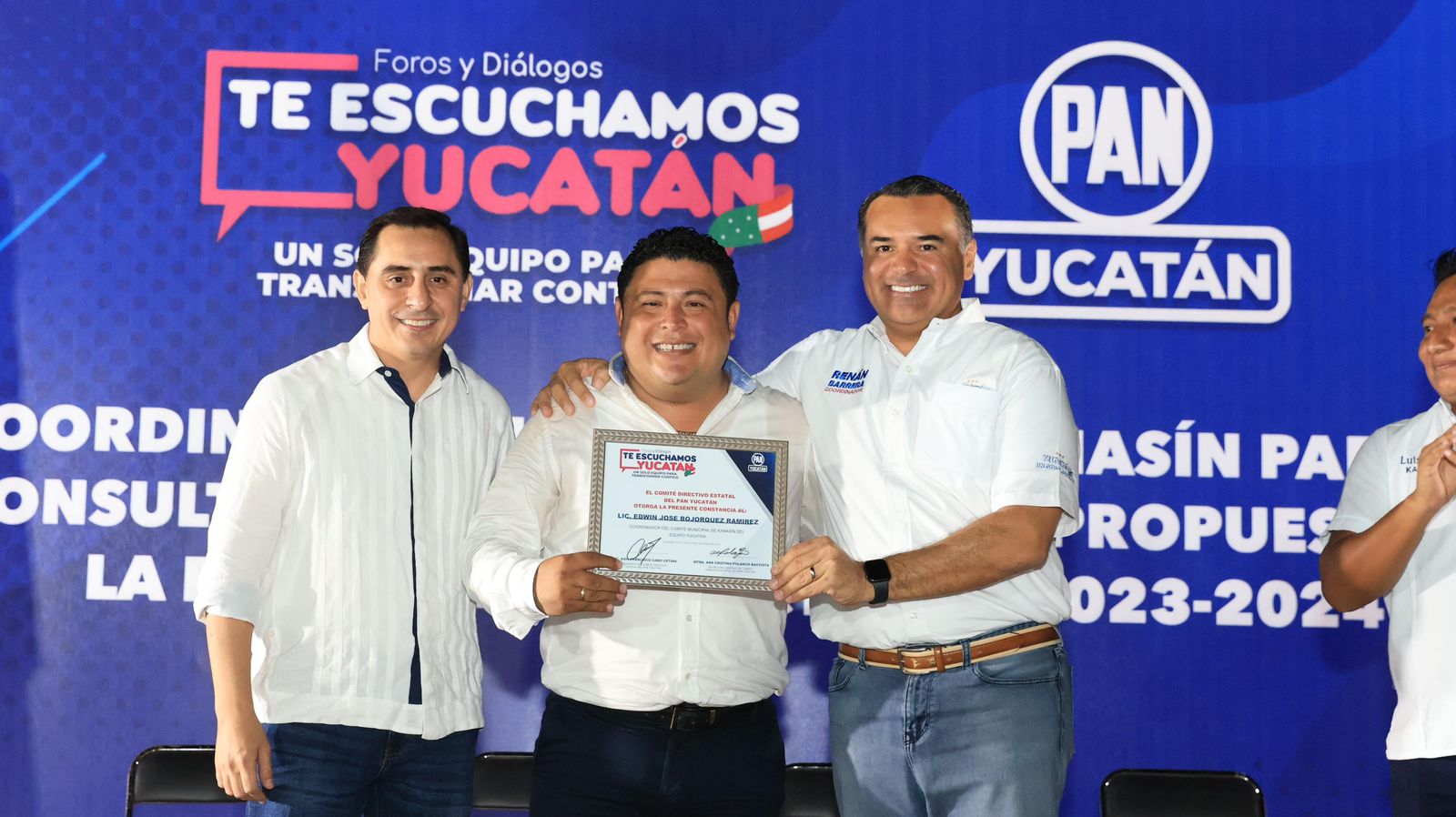 El coordinador estatal del Equipo Yucatán, Renán Barrera Concha, y el presidente del PAN Yucatán, Asís Cano Cetina, entregaron a Edwin Bojórquez Ramírez su nombramiento como coordinador del Equipo Yucatán en Kanasín.