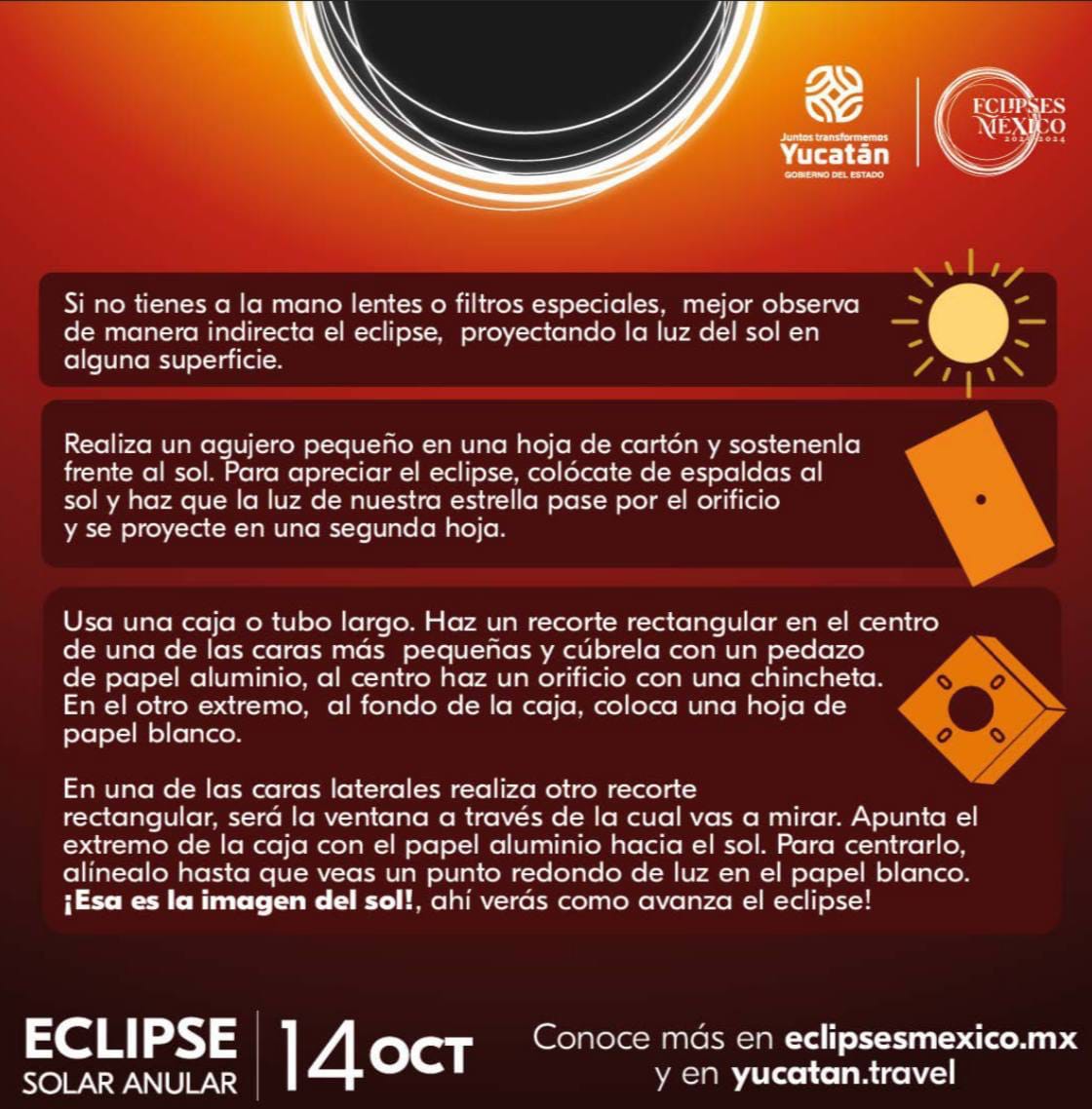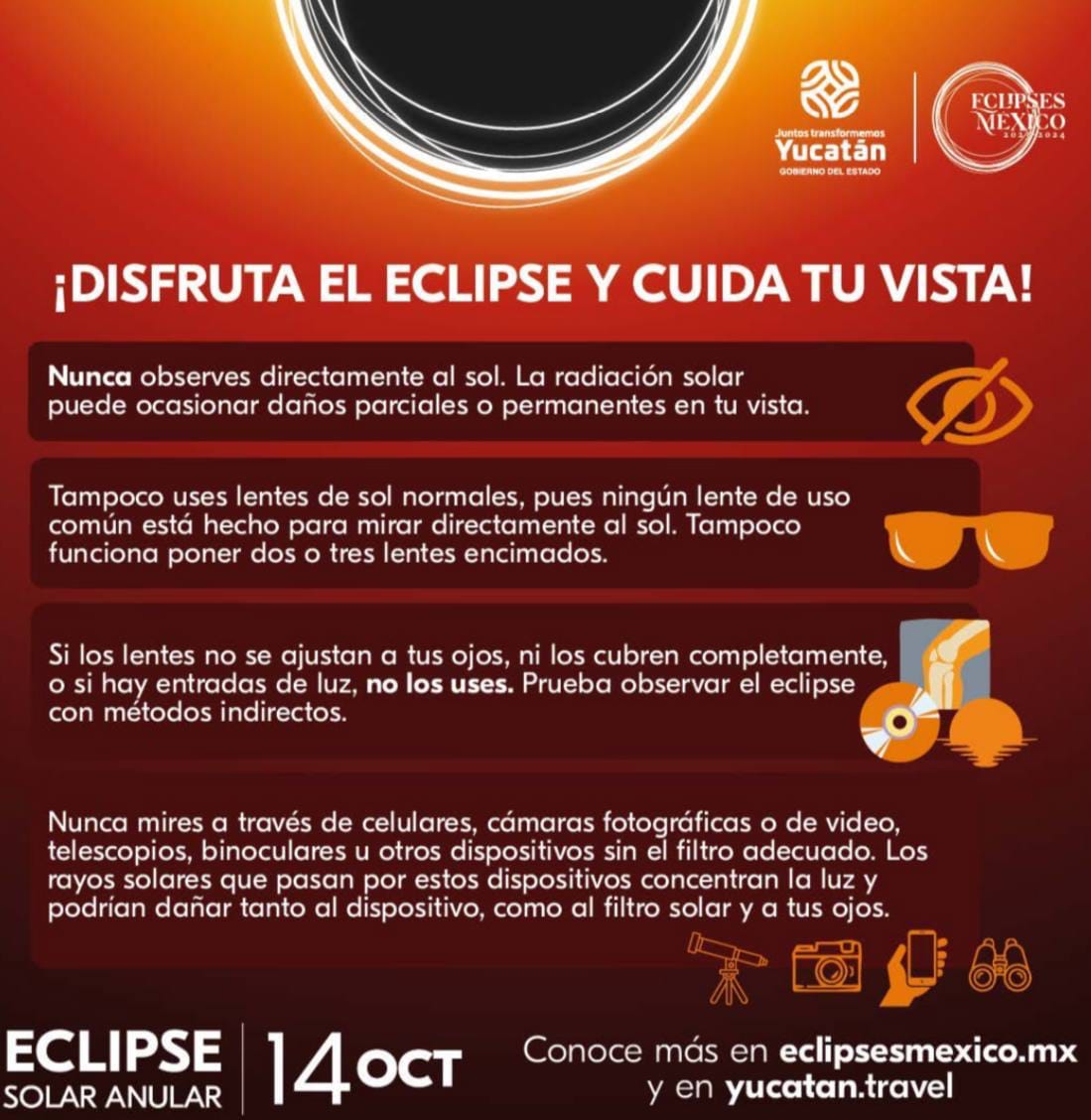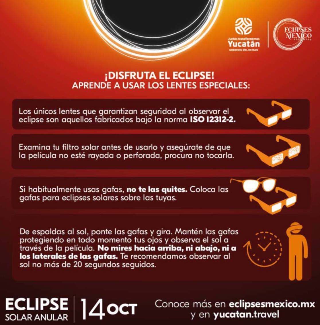 La Secretaría de Salud del estado y el Comité Yucatán de Eclipses 2023-2024 hicieron un llamado a la población a seguir las recomendaciones y medidas adecuadas para atestiguar de forma segura y preservar la salud visual durante el eclipse solar anular que se podrá observar en la entidad el próximo sábado 14 de octubre en la entidad.