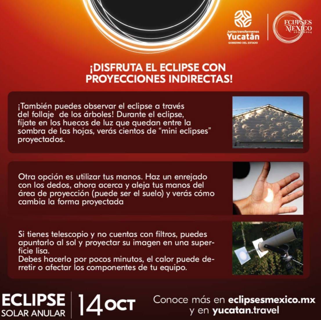 La coordinadora operativa del Comité Yucatán de Eclipses 2023-2024 afirmó que en caso de no contar con lentes certificados, este fenómeno se puede disfrutar a través de proyecciones indirectas, como en el reflejo que se observa de la luz que atraviesa por los huecos del follaje de los árboles; haciendo un enrejado con los dedos, reflejando el sol por el el orificio hecho a una cartulina o cartón y usando un espejo para proyectar la imagen en una pared blanca.