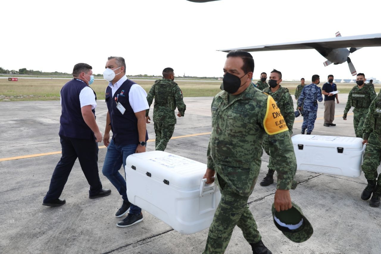 Por instrucción del Gobernador Mauricio Vila Dosal, el director de Prevención y Protección de la Salud de la SSY, Carlos Isaac Hernández Fuentes, acudió a la Base Aérea Militar (BAM) Número 8 para supervisar la llegada de este nuevo cargamento, que arribó a bordo de una aeronave Hércules de la Fuerza Aérea Mexicana matrícula 3611 proveniente de la Ciudad de México, que tocó territorio estatal a las 1:41 de la tarde.