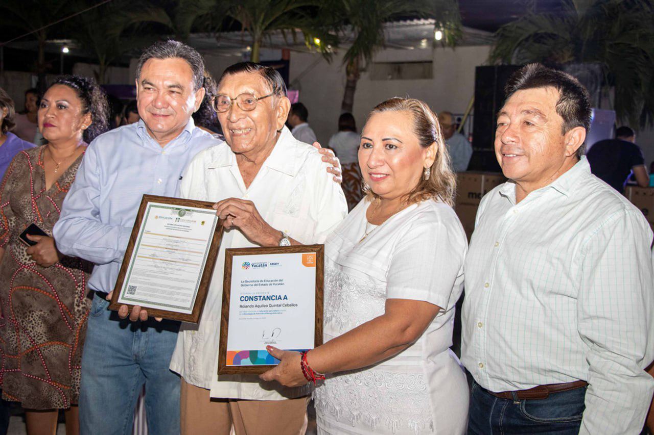 En el marco de la actividad, Vidal Aguilar entregó el certificado de secundaria a don Rolando Quintal Ceballos de 95 años, oriundo de Hunucmá y beneficiario de la Estrategia Estatal de Atención al Rezago Educativo, que demuestra de que la edad no es un límite para retomar los objetivos de estudios e incluso es una historia de inspiración para todo Yucatán. Previamente obtuvo el grado de primaria en la primera etapa de la misma iniciativa.