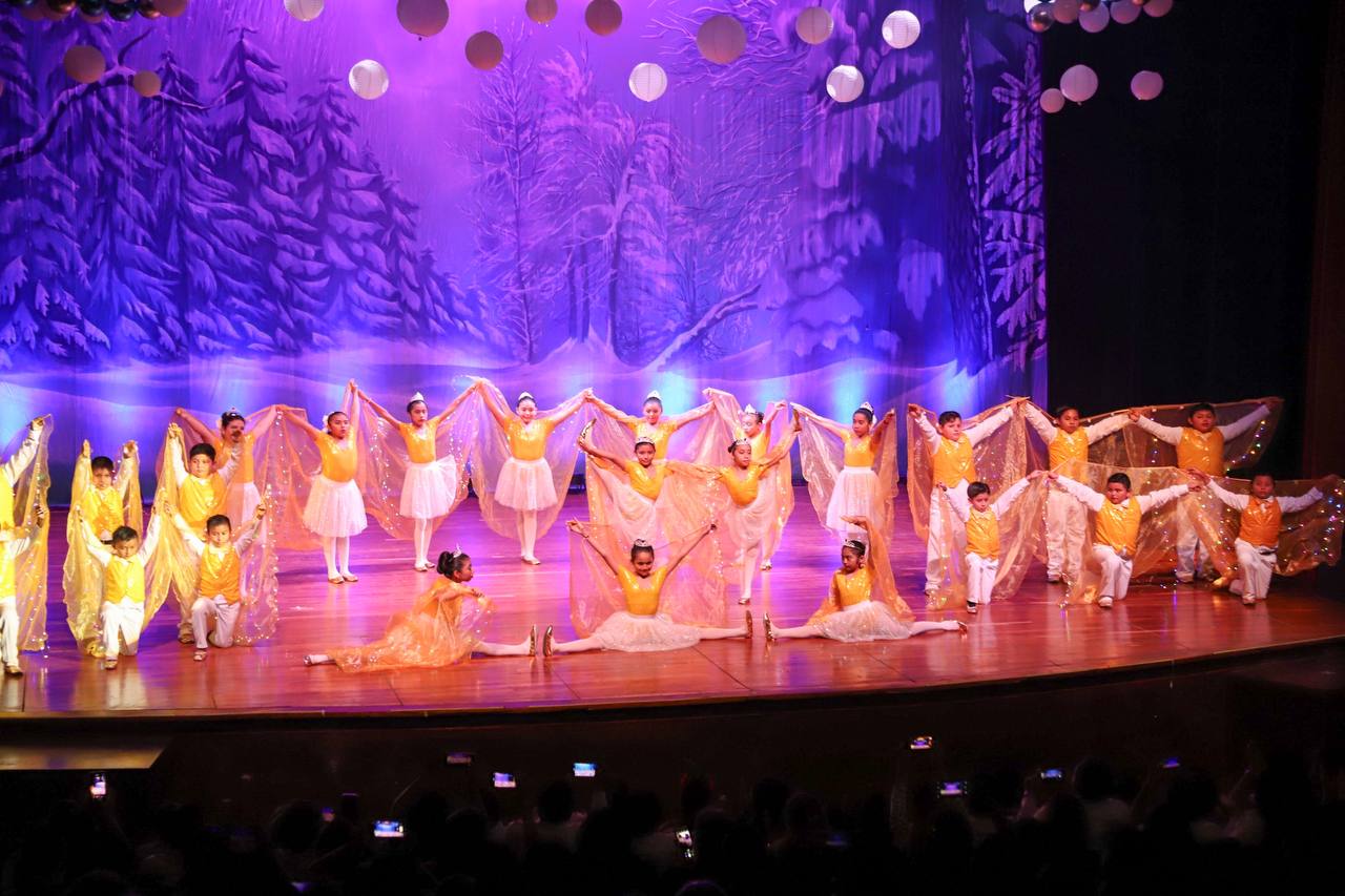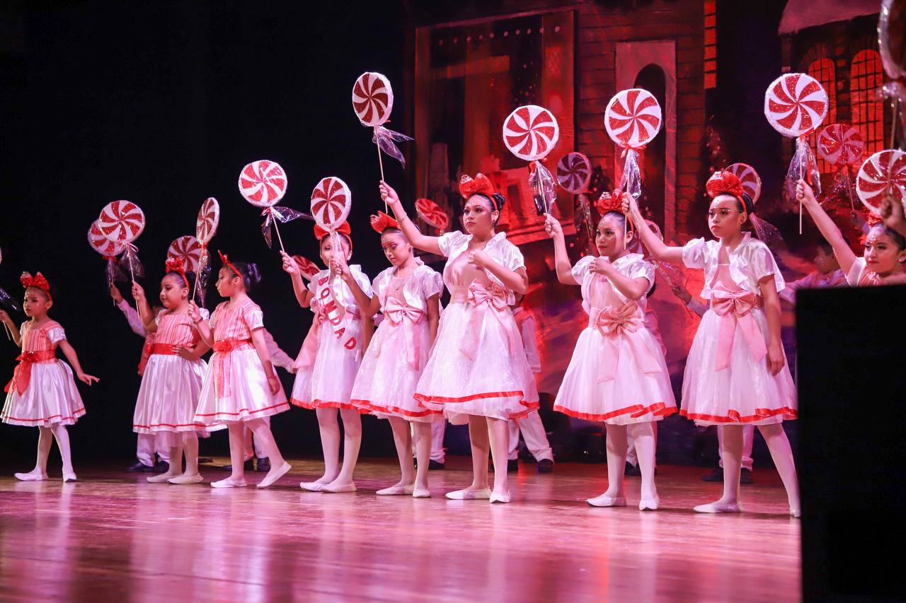 Entre cambios de telones, que mostraban villas navideñas, bosques de pinos nevados y arbolitos de navidad; y vestidos con hermosos y elaborados trajes de brillantes colores, rojos, verdes, dorados y plateados, que incluían luces y tocados espectaculares; copos de nieve, esferas, arbolitos navideños, estrellas, muñecos de nieve, elfos, caramelos, Santa Claus, la Señora Claus y duendes, los estudiantes bailaron al ritmo de alegres y sonoras melodías navideñas.