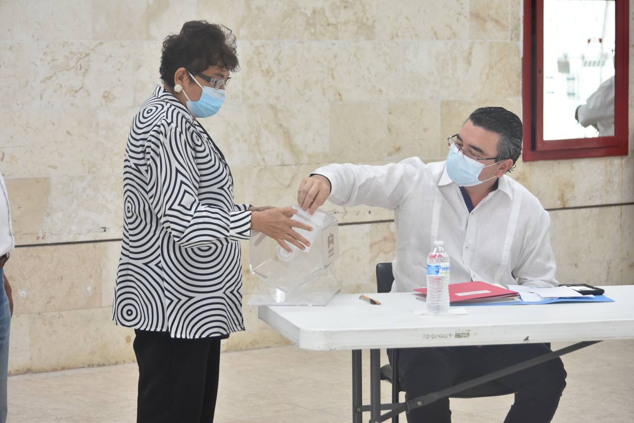 Acorde lo establecido en los artículos 28 y 29 del Reglamento Interior del Tribunal Superior de Justicia del Estado, los magistrados y magistradas acudieron a la sesión realizada esta tarde en la sede del Tribunal Superior y emitieron su voto de forma secreta e inmediatamente, como lo prevé este ordenamiento, la Secretaria General de Acuerdos Lic. Mireya Pusí, extrajo una por una cada boleta, leyendo en voz alta el nombre registrado en las mismas, hasta completar el escrutinio de su totalidad.