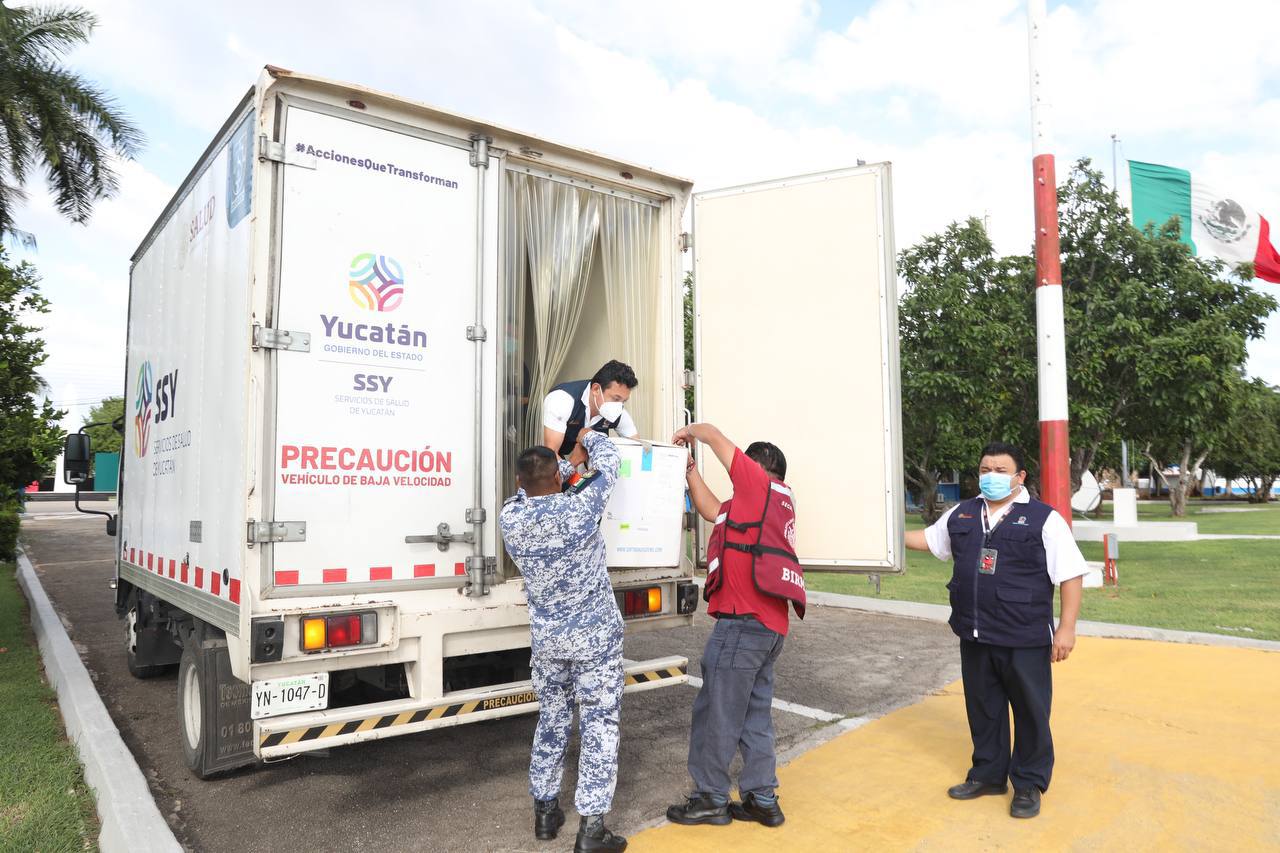 Acompañado del coordinador Estatal para la Vacunación Covid-19, capitán de Corbeta Carlos Gómez Montes de Oca, responsable Estatal de Vacunación Universal de la SSY, Alejandro Díaz Sánchez, el funcionario estatal constató la descarga del cargamento a cargo del personal del Ejército, que lo colocó en un camión thermoking de la SSY para su traslado al almacén y posterior distribución.