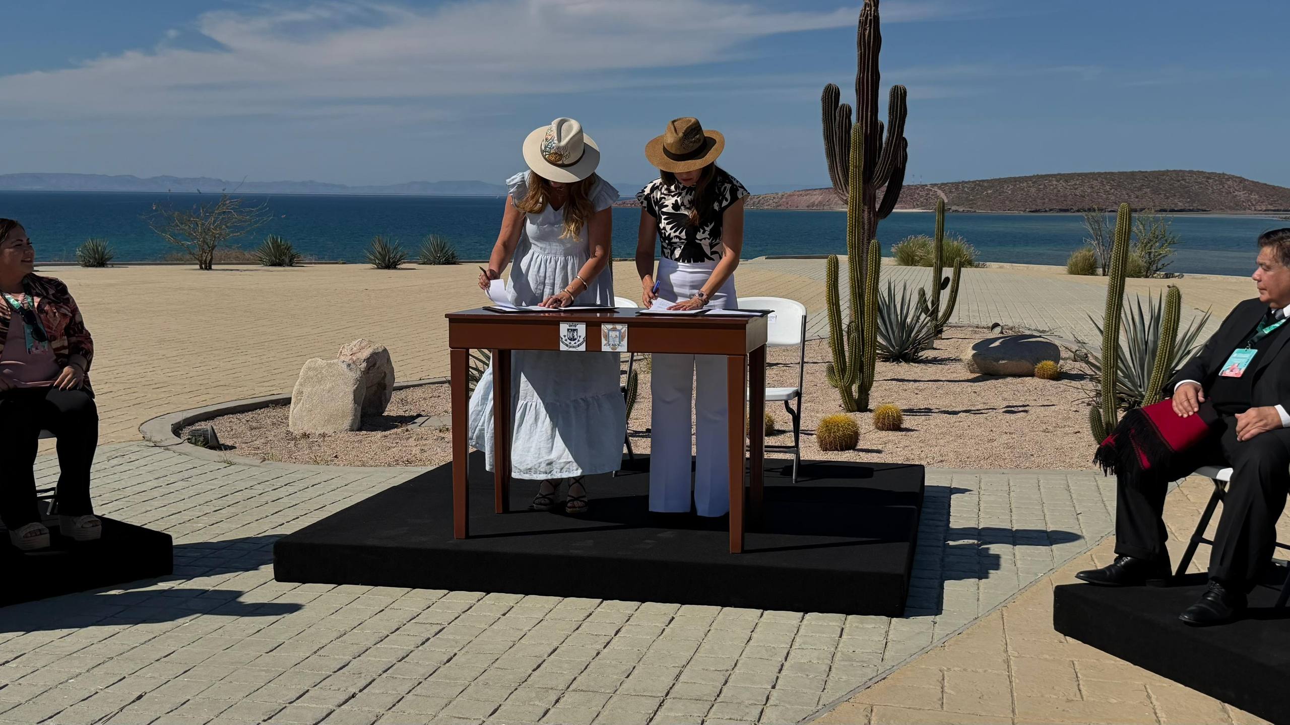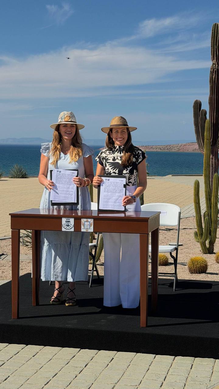 Posteriormente, Cecilia Patrón firmó un convenio de colaboración con el municipio de La Paz, Baja California Sur, que encabeza Milena Paola Quiroga Romero, para compartir experiencias en materia económica, turística, cultura y empleo.