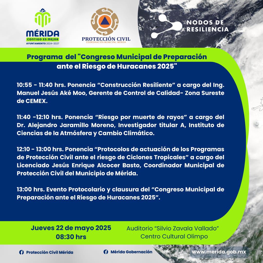 El Ayuntamiento que encabeza Cecilia Patrón Laviada, a través de la Coordinación de Protección Civil Municipal, invita a la ciudadanía a participar en el “Congreso Municipal de Preparación Ante el Riesgo de Huracanes Mérida 2025”.