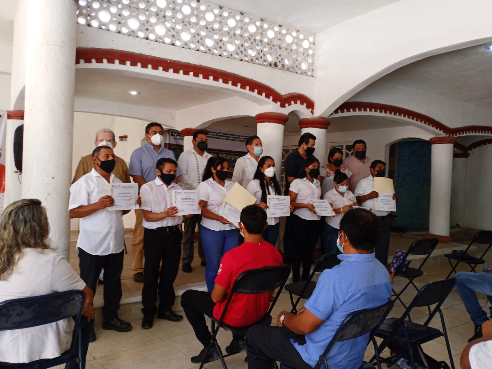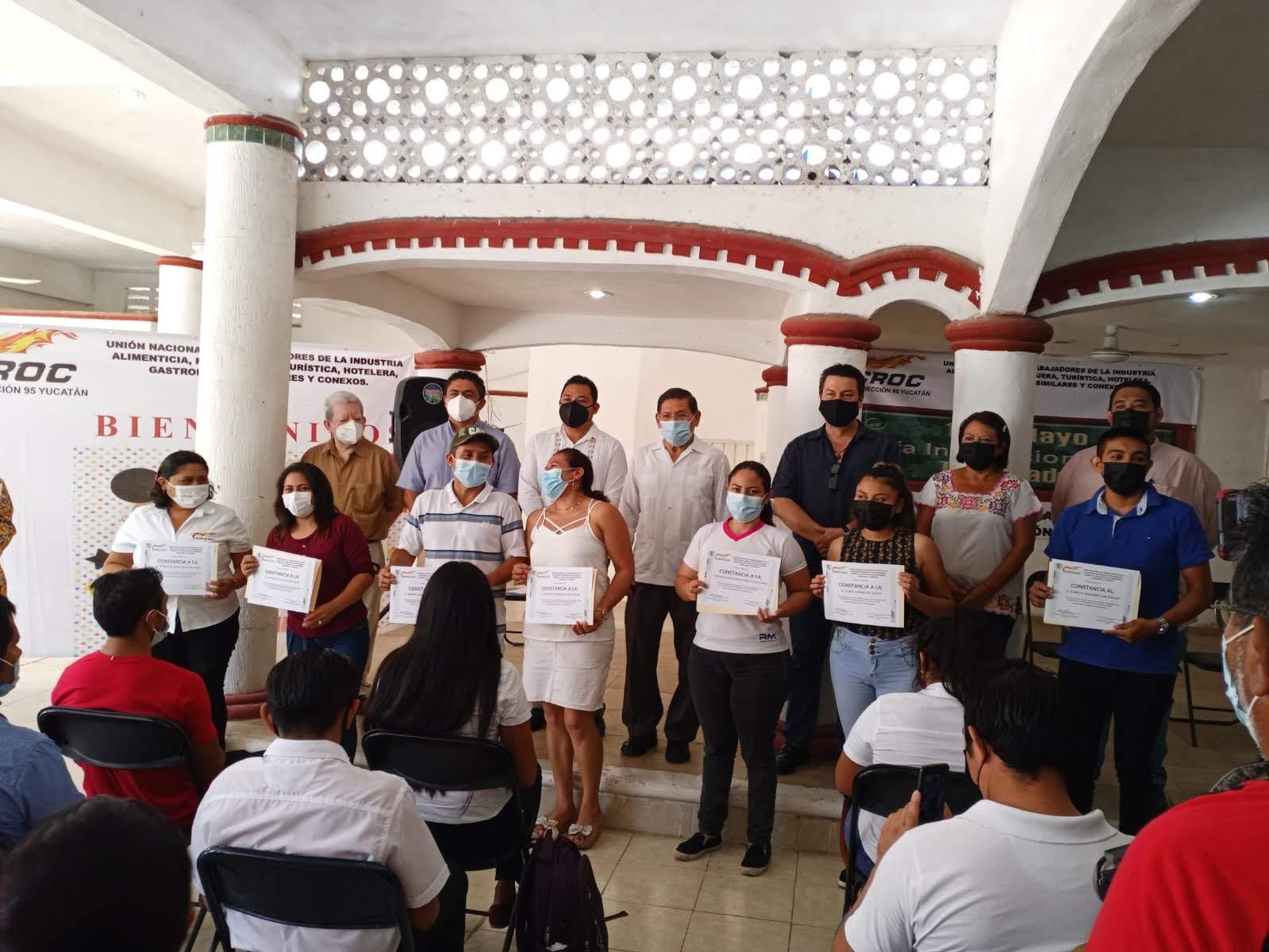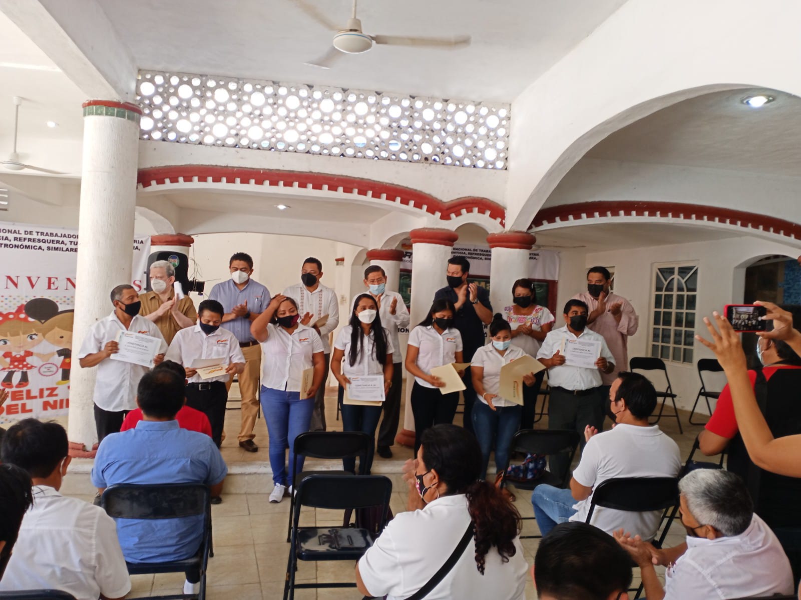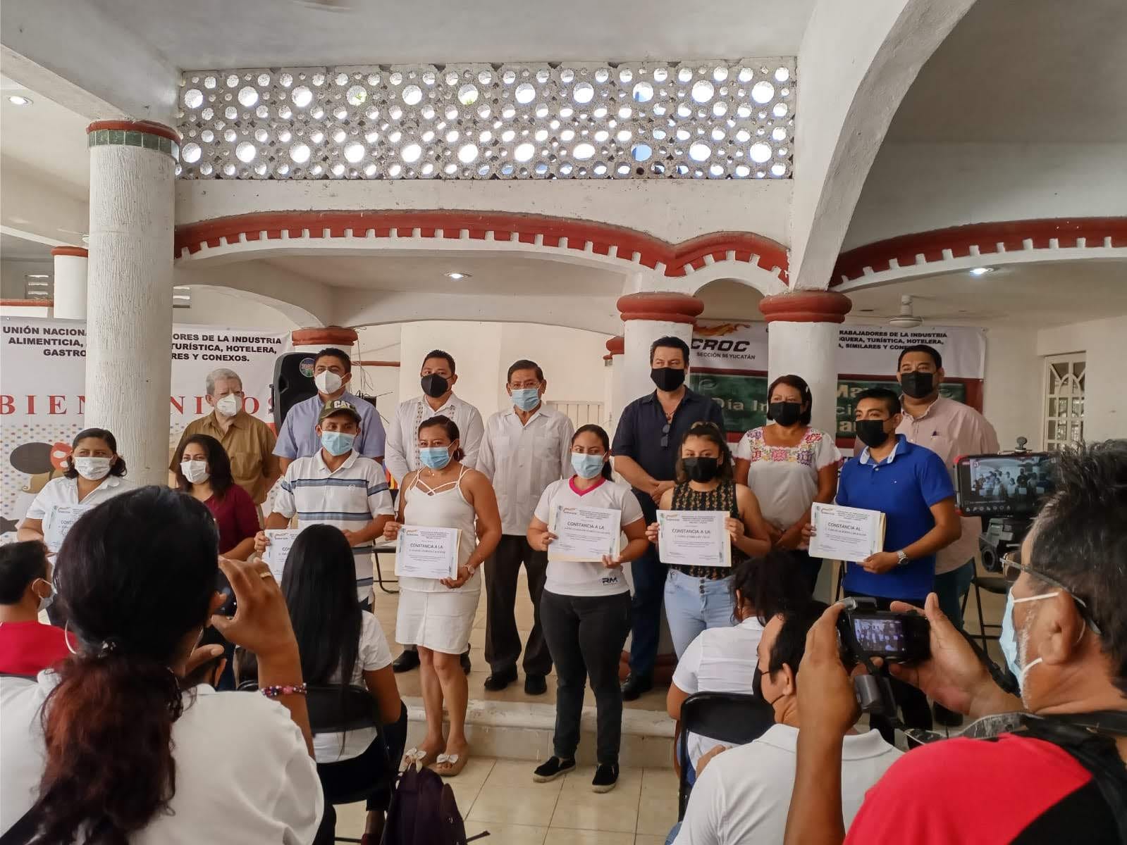 Empleados de las empresas Kekén y Bachocco recibieron ayer sus constancias como delegados sindicales y otros por concluir sus estudios medio superior, informó el secretario general de la sección 95 de la Unión Nacional de la Industria Alimenticia, afiliada a la CROC, Cornelio Mena Kú, en el marco de la celebración del Día del Trabajo.