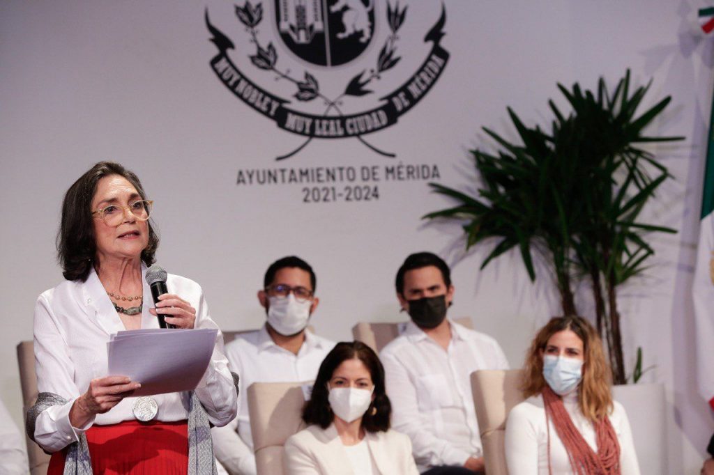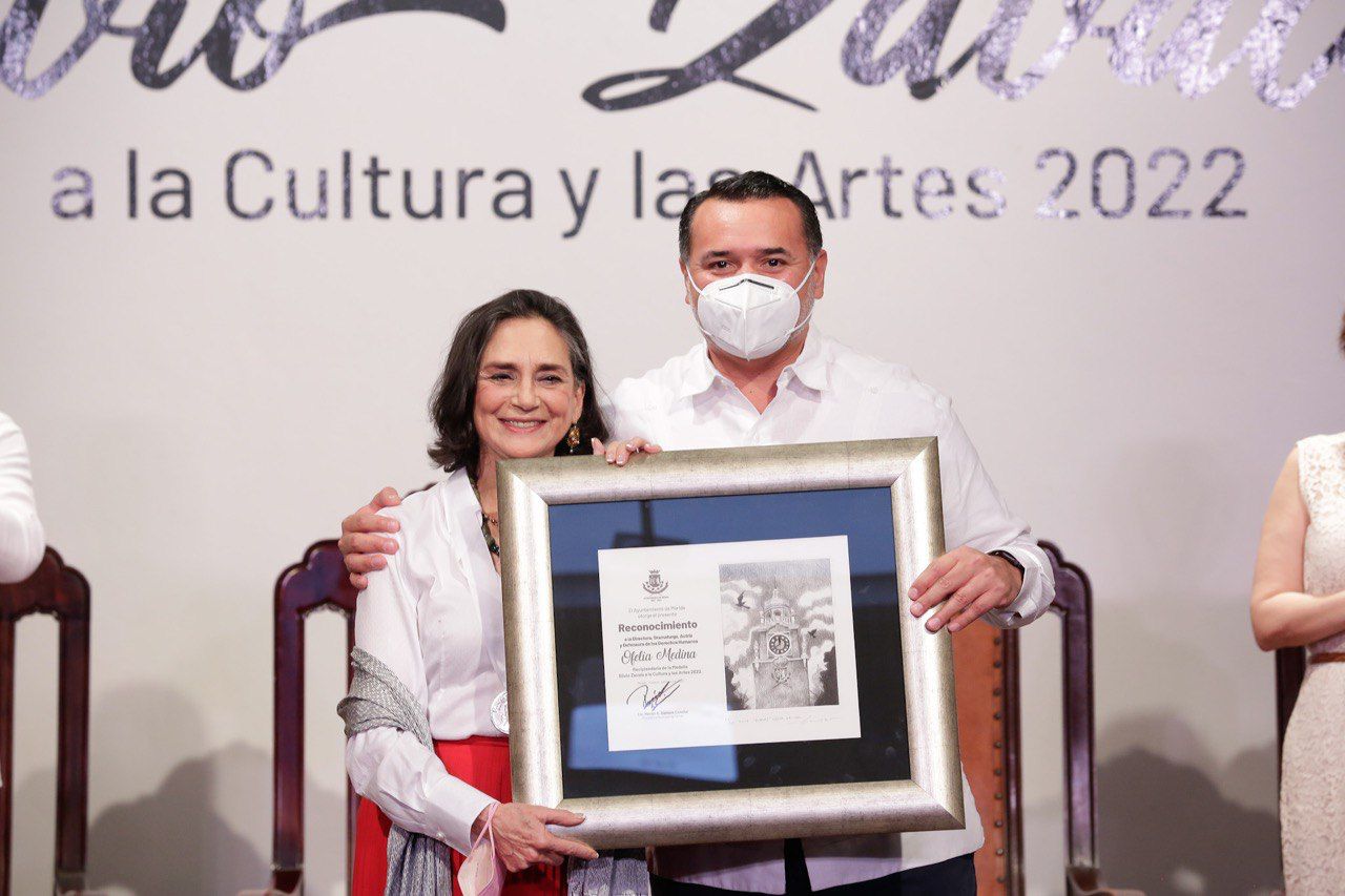 El Alcalde Renán Barrera Concha entregó esta noche la Medalla Silvio Zavala a la Cultura y las Artes 2022 a la dramaturga Ofelia Medina, como reconocimiento a sus contribuciones en el campo del teatro y sus acciones para cuidar y promover la defensa de los Derechos Humanos.