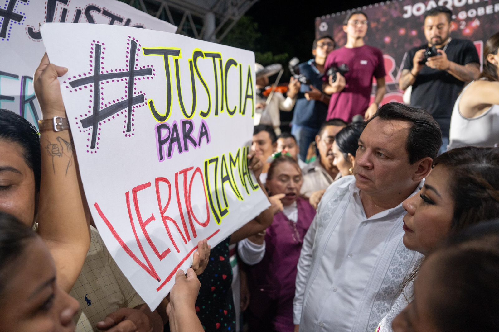 Durante su visita a Izamal, un grupo de amigos y familiares de “Vero” (V.C.T.), se acercó al Gobernador electo para “exigir justicia” en torno al presunto feminicidio de la joven; Díaz Mena escuchó al grupo que, con pancartas en mano, exige una nueva autopsia para el esclarecimiento de los hechos, ante lo que el gobernador electo externó su solidaridad y se comprometió a revisar el caso.