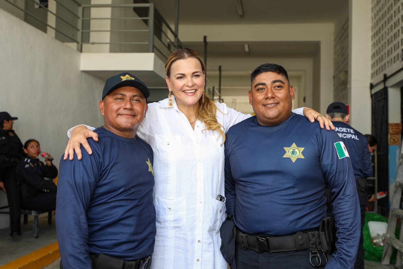 Al concluir el desfile conmemorativo, Cecilia Patrón visitó las instalaciones de la Policía Municipal de Mérida para felicitar a los elementos policiales por su destacada participación durante el desarrollo de estas actividades.