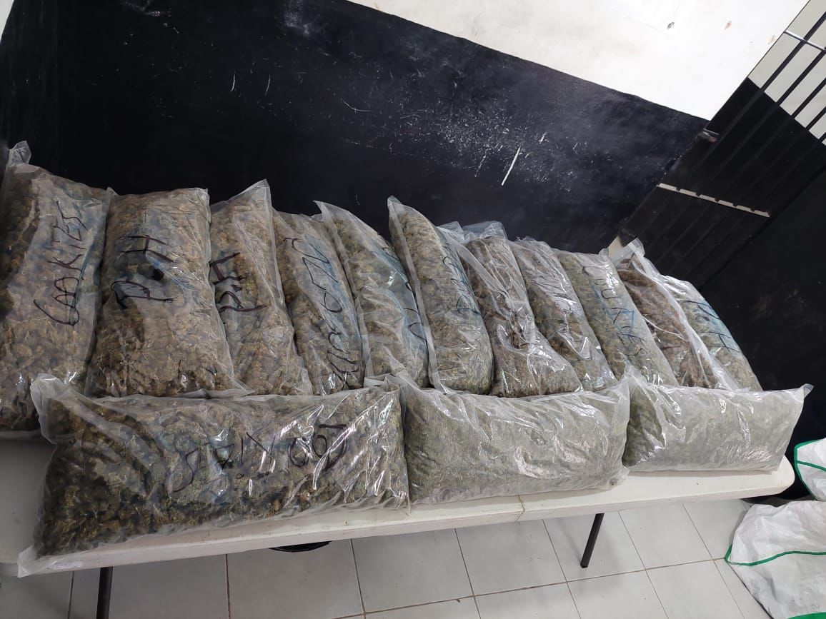 Agentes de la Policía Municipal de Kanasín detuvieron a dos sujetos en la Colonia San Antonio Kaua 3 con aproximadamente 14 kilos de cannabis, el cual guardaban dentro de dos bolsas tipo raffia.