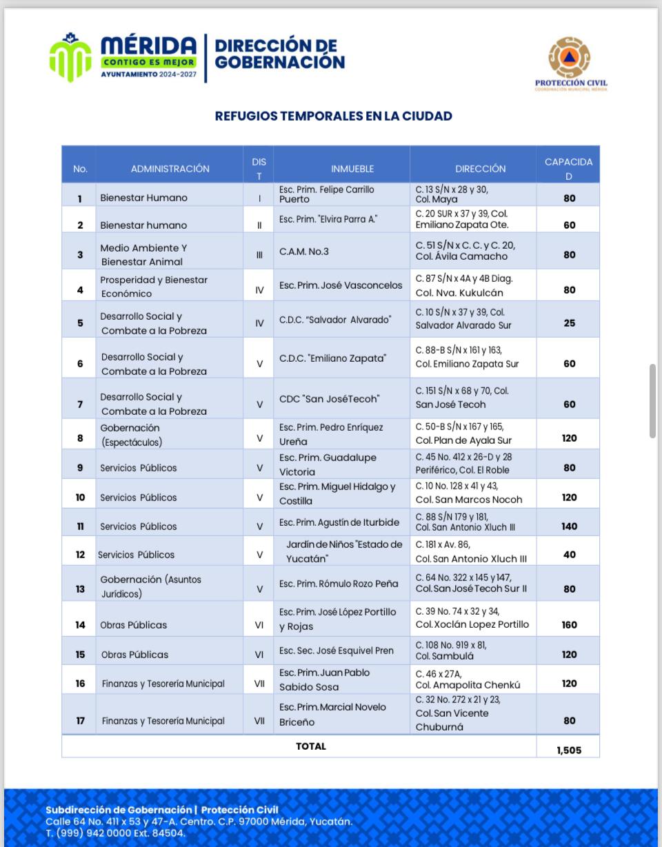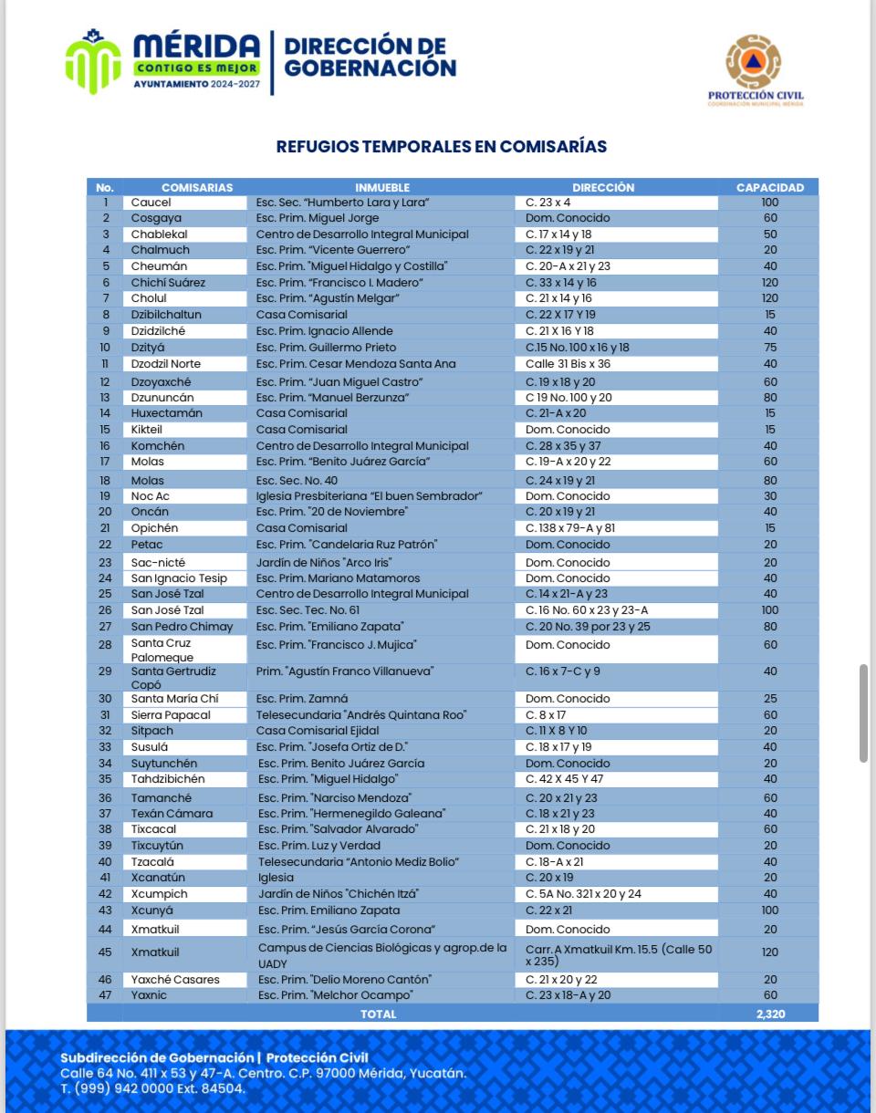 La alcaldesa señaló que ya se han habilitado 64 inmuebles que servirán como refugios temporales, tanto en Mérida como en las comisarías.