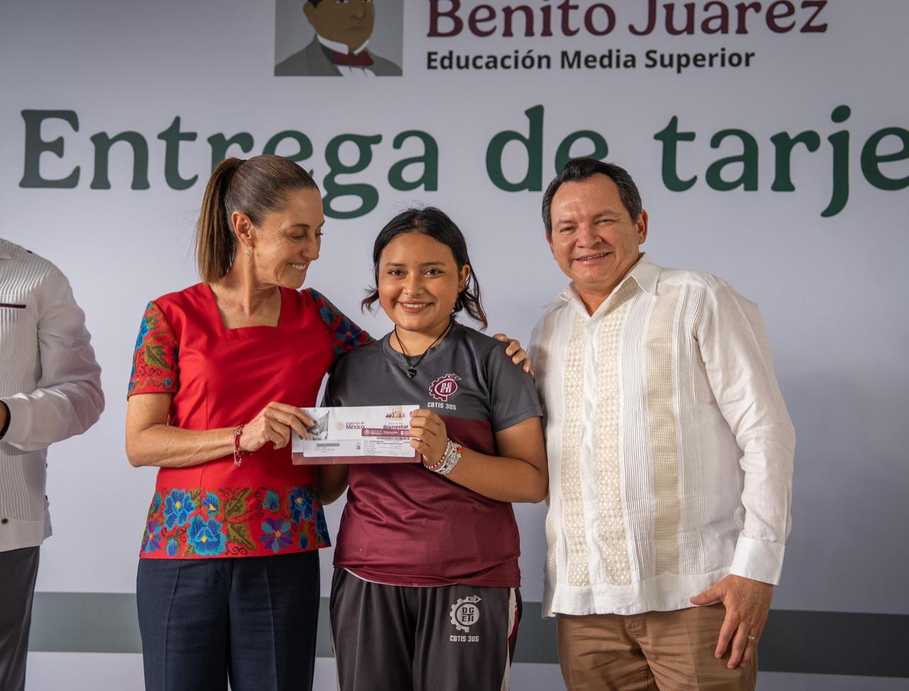 Añadió que, con la entrega de las tarjetas de la Beca Benito Juárez, se busca garantizar que ningún joven abandone la preparatoria por motivos económicos, reiterando el llamado a que concluyan el bachillerato y continúen con una carrera profesional, porque “la educación es la mejor herencia que les pueden dar sus padres”.