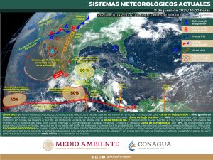 no. 2 que se extiende al sur de la región y el alto contenido de humedad estarán favoreciendo condiciones de cielo medio nublado a nublado con probabilidad de intervalo de chubascos con tormentas a lo largo de Quintana Roo, así como chubascos fuertes con tormentas puntuales muy fuertes en el norte y sur de Campeche y también en el noroeste de Yucatán. Asimismo, se prevén temperaturas calurosas a muy calurosas durante el día y cálidas al amanecer, con viento dominante del este-sureste cambiando por la tarde al noreste de 15 a 25 km/h y rachas mayores a 45 km/h sobre la costa de Yucatán y Campeche.