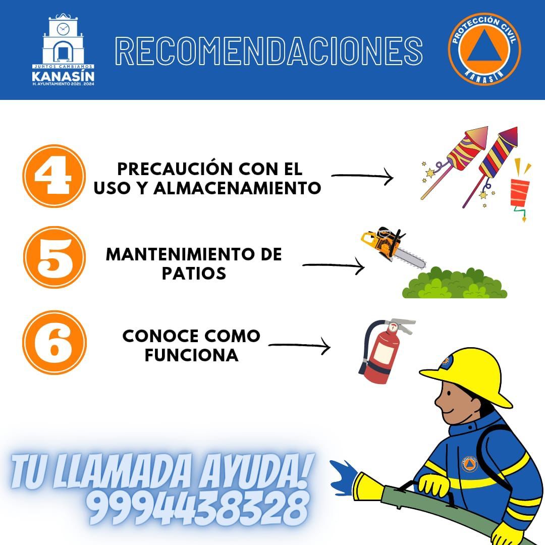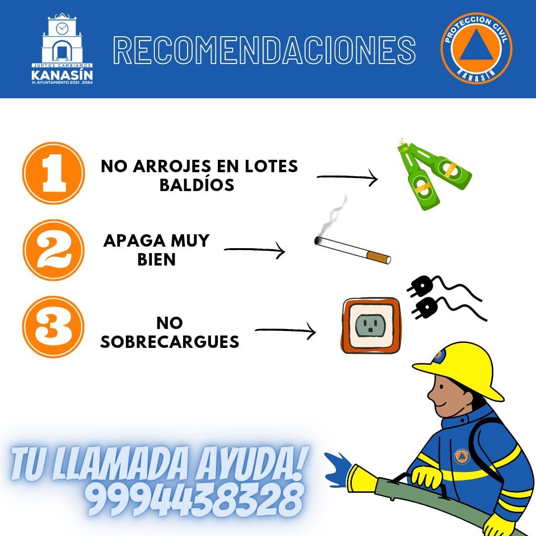 Ante el inicio de la época de altas temperaturas y de la temporada de incendios, Protección Civil de Kanasín se reporta listo para prevenir y combatir ese tipo de eventos que pudieran poner en riesgo la vida de las personas, por muy pequeño que sea el incendio o fogata, hay que reportarlo antes que cresca a grandes dimencioines.