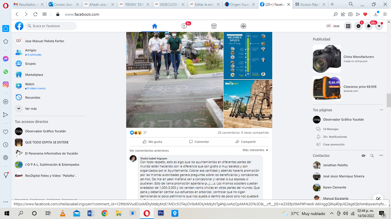 En redes sociales se está hablando mucho sobre un nuevo atractivo, pero no crean que son las calesas motorizadas, ni aquellas luces que surcaban el paseo de Montejo, nada de eso es, están hablando de al parecer un nuevo “atractivo negocio” que le llenarán los bolsillos al “Reni”, se trata de la renta de patinetas motorizadas, los famosos (Sooter eléctrico), para realizar recorridos en 12 puntos con edificios históricos y culturales sobre la avenida del Paseo de Montejo.
