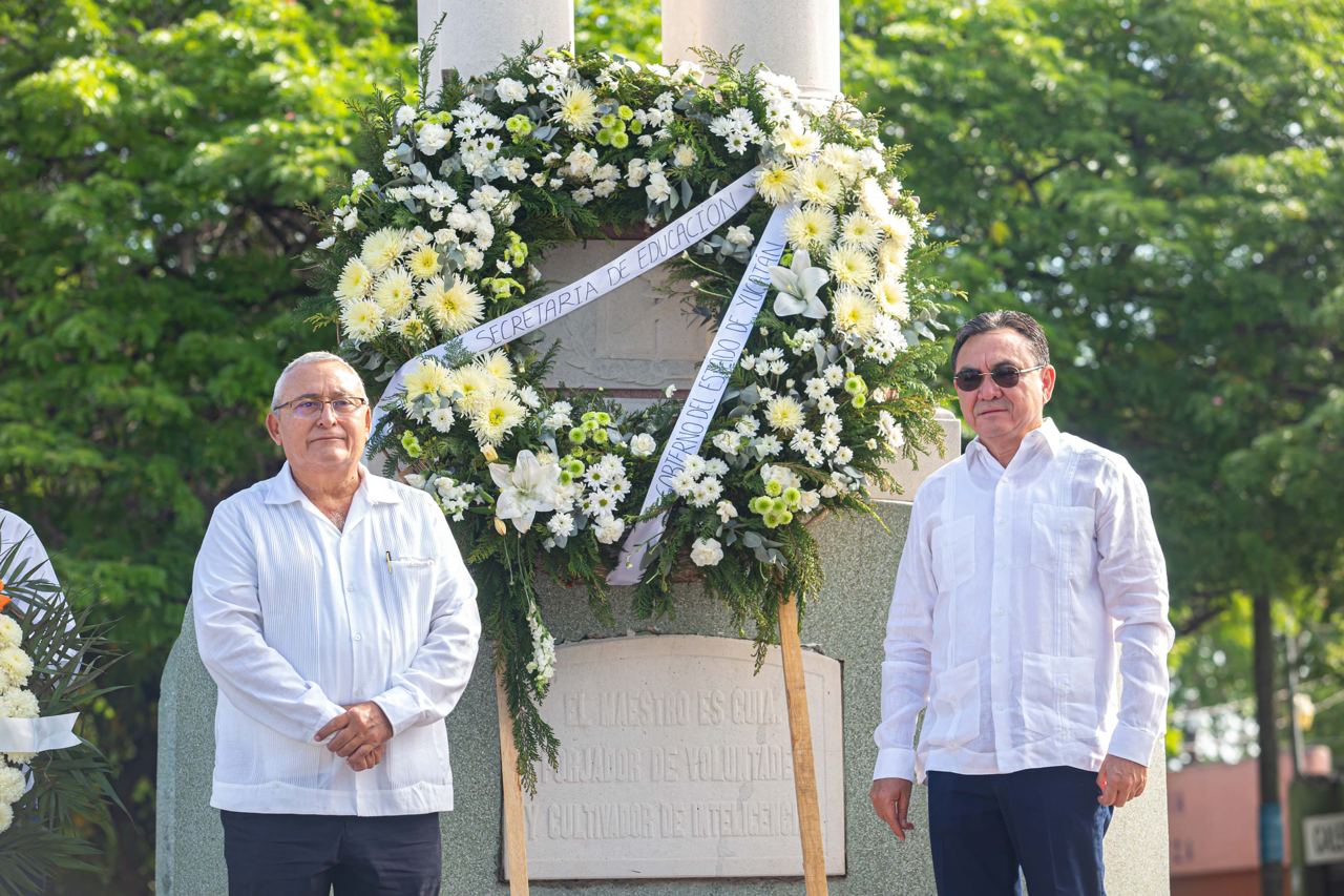En el marco del Día del Maestro, Liborio Vidal Aguilar, titular de la Secretaría de Educación del Gobierno del Estado, encabezó la ceremonia de la ofrenda floral y guardia de honor para conmemorar el legado del magisterio yucateco y reconocer la dedicación de los docentes en la transformación de Yucatán.