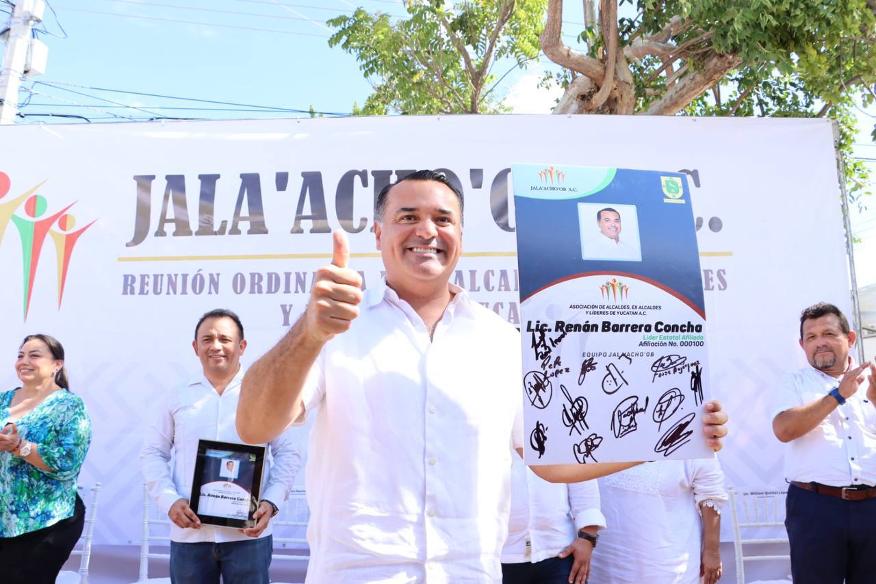 Al concluir su mensaje, Juan Sulub Cabrera, exalcalde priista de Tunkás y presidente de la A.C “Ja’lacho’ob”, junto con representantes de diversas filiaciones políticas, entregaron un certificado que acredita a Renán Barrera como líder honorario de esta asociación plural…(OGY)