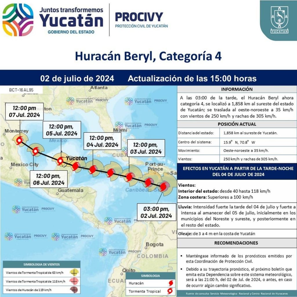 Ante la aproximación del huracán “Beryl” a Yucatán, ubicado esta tarde a mil 858 km al sureste del estado con vientos de categoría 4, de 250 km/h y rachas de 305 km/h, la Coordinación Estatal de Protección Civil (Procivy), llama a la población a tomar sus precauciones, resguardarse en sus domicilios o en su caso acudir a los refugios temporales.