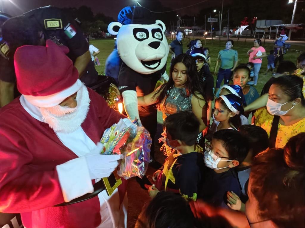 Santa Claus y la mascota de la Policía Municipal de Kanasín llevaron la noche de ayer sábado mucha alegría a decenas de niñas y niños de diversas colonias del municipio, pues les entregaron regalos que fueron donados por elementos de la corporación y funcionarios del Ayuntamiento.