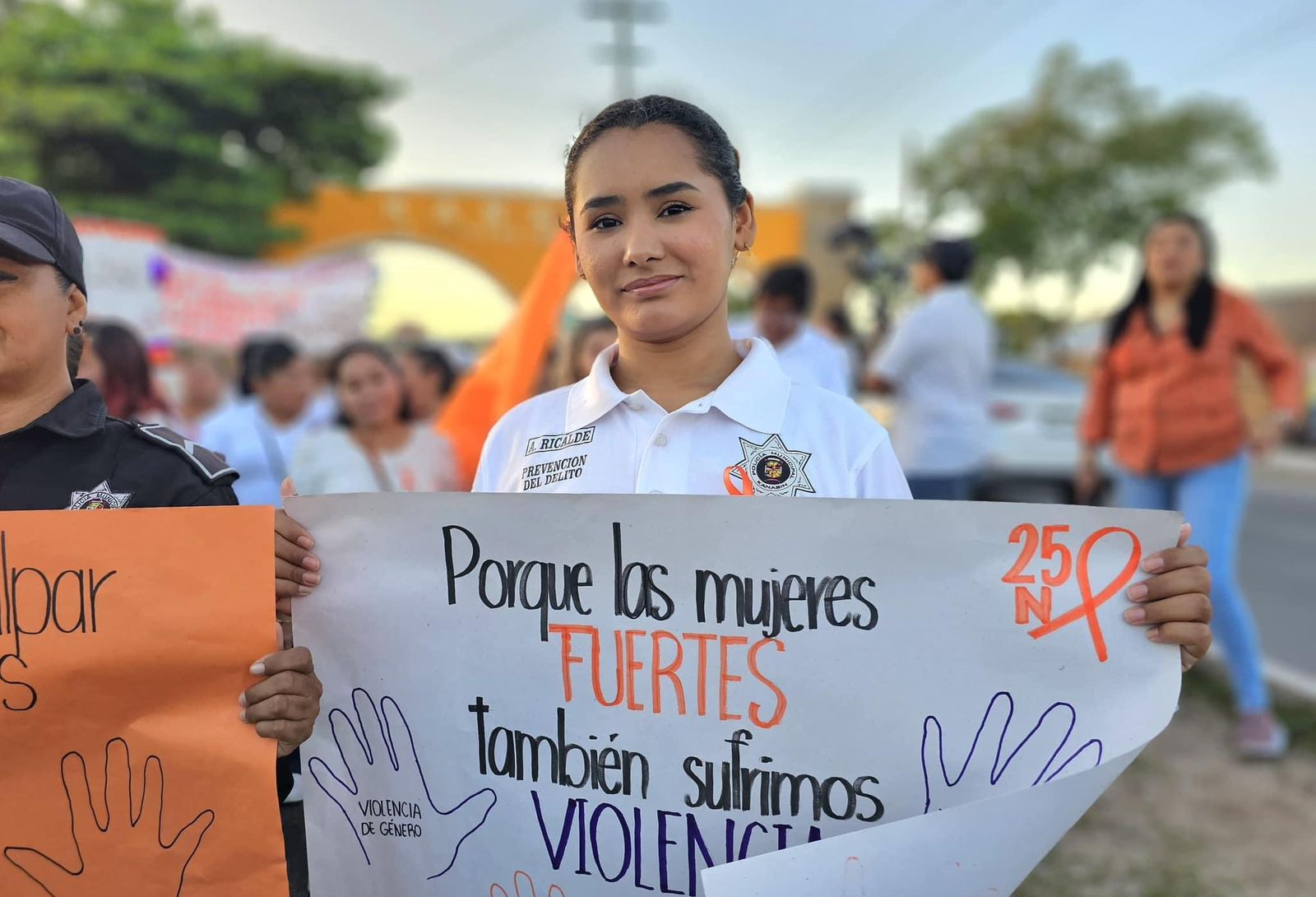 Portando pancartas y un lazo conmemorativo en el pecho, las mujeres caminaron del arco hasta el Palacio Municipal, cerca de 2 kilómetros, y a su paso se llevaron aplausos de la gente que salió a las puertas de su casa para ver el contingente, al que se unió un grupo de mujeres policías portando sus pancartas de apoyo a este movimiento pacifico.