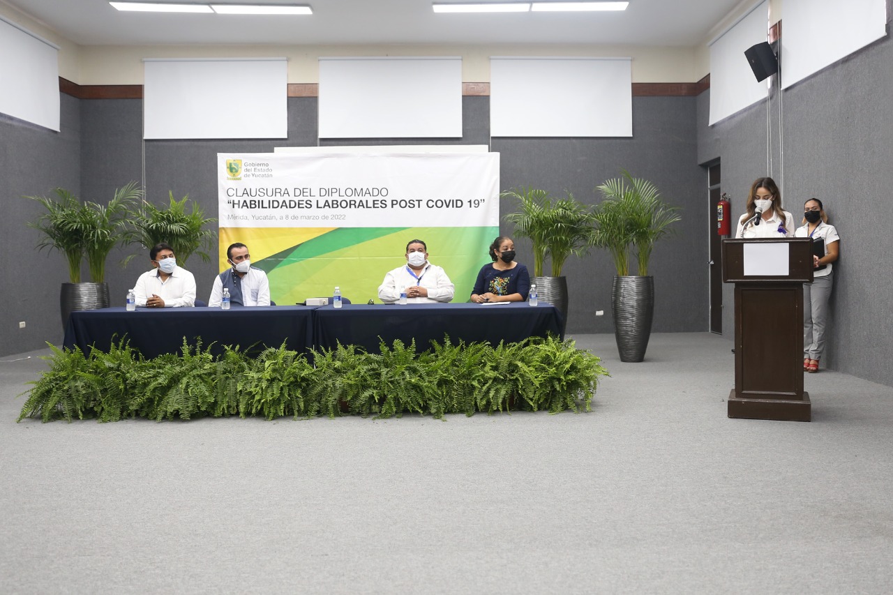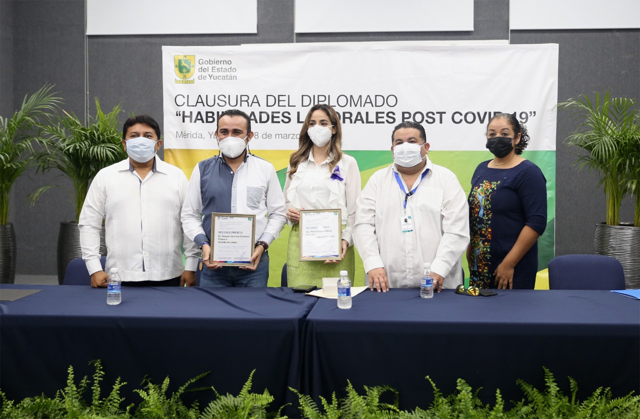 Con la participación de 70 personas de 15 empresas, se llevó a cabo la clausura del Diplomado de Habilidades Laborales Post Covid-19, que coordina la Secretaría de Fomento Económico y Trabajo (Sefoet), a través de su Subsecretaría del Trabajo. Dicho programa se desarrolla con el objetivo de robustecer los perfiles profesionales de las y los yucatecos, y así, mantener y elevar la calidad del capital humano especializado, que se desempeña en las distintas industrias establecidas en el estado. El subsecretario del Trabajo, Adolfo González Martínez, reconoció el esfuerzo y compromiso tanto de las compañías como sus integrantes, por su participación, y subrayó la importancia de la capacitación como herramienta para reforzar conocimientos y habilidades, y sumar al crecimiento de la entidad. “Tenemos claro que las empresas son el motor de la economía; de ahí la importancia de preparar a los capacitadores y colaboradores, que estarán en sus centros laborales”, apuntó el funcionario, junto con la representante de la Asociación Mexicana de Mujeres Empresarias de Yucatán (Ammeyuc), Wendy Cámara Asencio, y el alcalde de Umán, Gaspar Ventura Cisneros Polanco.