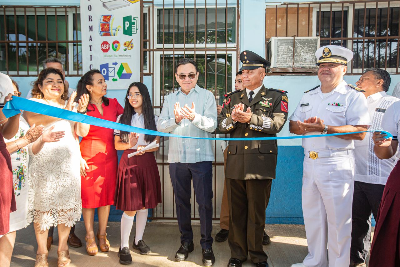 Al finalizar los honores de la bandera en conmemoración del natalicio de José Vasconcelos, las autoridades cortaron el listón y recorrieron el taller de informática en donde Vidal Aguilar, a solicitud de la directora del plantel y el comité de padres de familia, autorizó la entrega de 10 computadoras para el turno matutino y 5 para el turno vespertino. Asimismo, hizo entrega de kits del programa “Mejora tu secu” a los directores de ambos turnos.