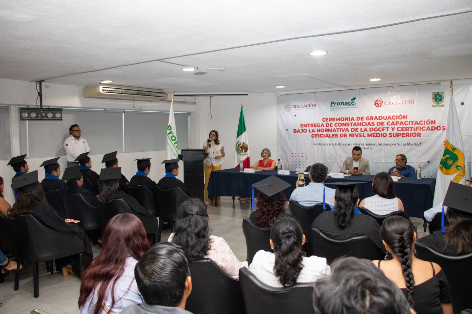 Fue así como en días pasados, en representación del Liborio Vidal Aguilar, titular de la Segey, jefa del departamento de Preparatorias Estatales y Particulares Incorporadas, Ligia Cicero Galán, participó en la ceremonia de graduación, en la que se entregaron certificados de bachillerato y constancias de capacitación bajo la norma de la Dirección General de Centros de Formación para el Trabajo (DGCFT).