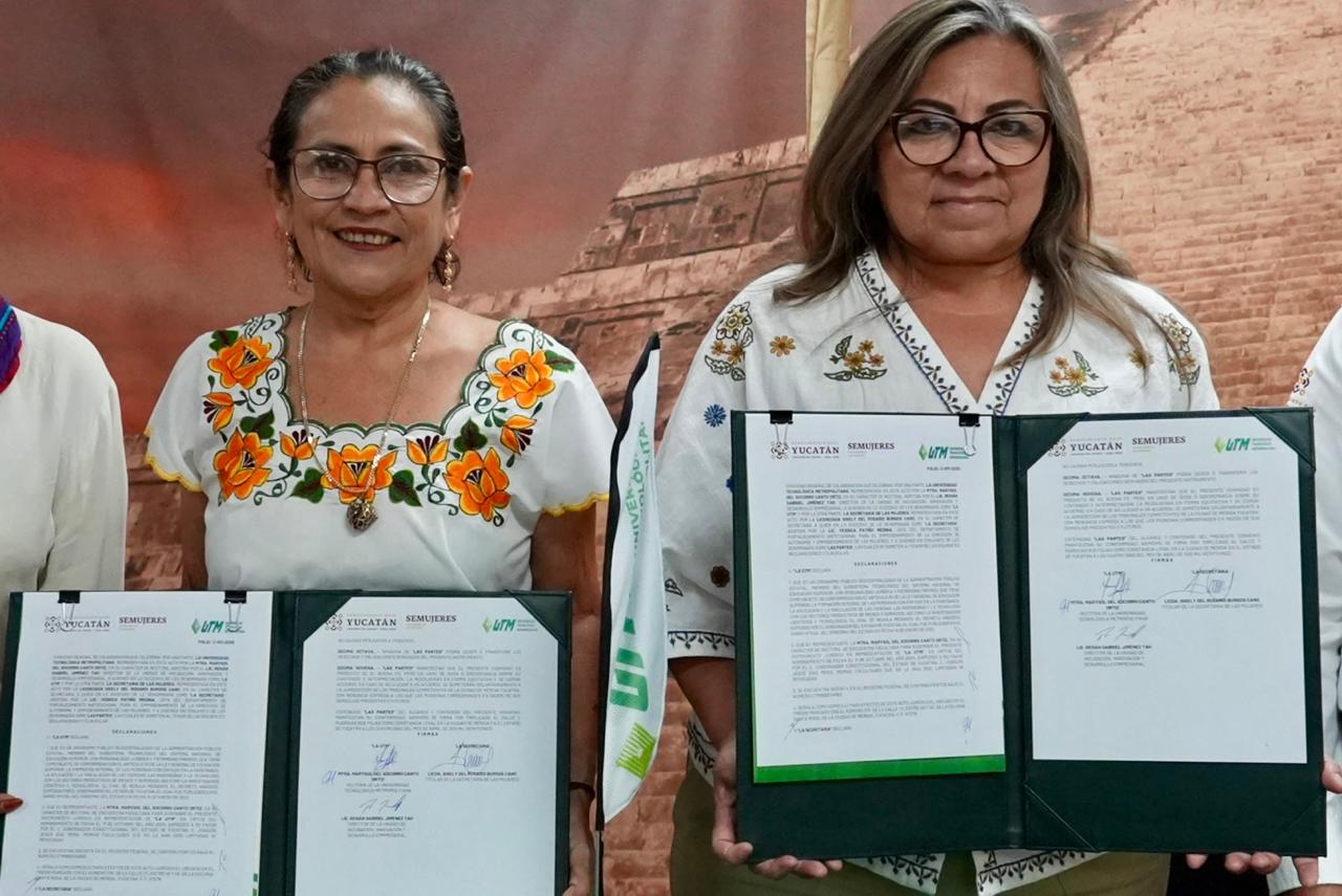 Con el objetivo de mantener el impulso al desarrollo de las mujeres en Yucatán, la Secretaría de las Mujeres (Semujeres) y la Universidad Tecnológica Metropolitana (UTM) firmaron un convenio de colaboración para la innovación educativa con perspectiva de género, como parte de las acciones enmarcadas en el Renacimiento Maya encabezado por el gobernador Joaquín Díaz Mena.