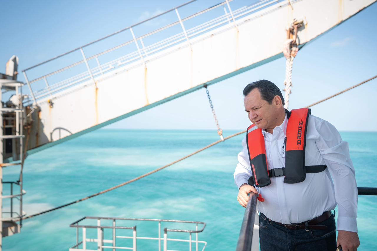 En visita al buque de dragado Fernando de Magallanes, el Gobernador Joaquín Díaz Mena informó que la primera etapa del dragado para la ampliación y modernización del Puerto de Altura de Progreso registra 90% de avance.