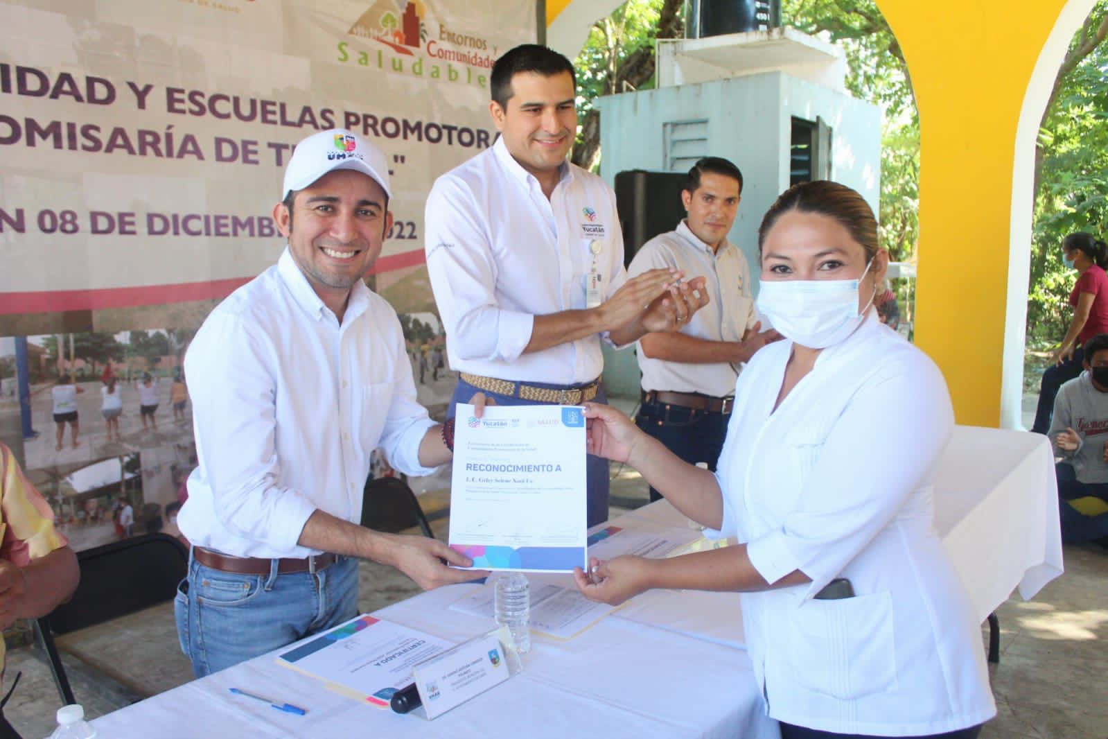 En el evento se reconoció a la ciudadana Elsi Guadalupe Celis Batun por tener la vivienda más limpia y se le entregó su Certificado de Escuelas Promotoras de la Salud al Preescolar “José María Iturralde Traconis” a la primaria “Primero de Mayo” y la secundaria Quetzalcóatl.