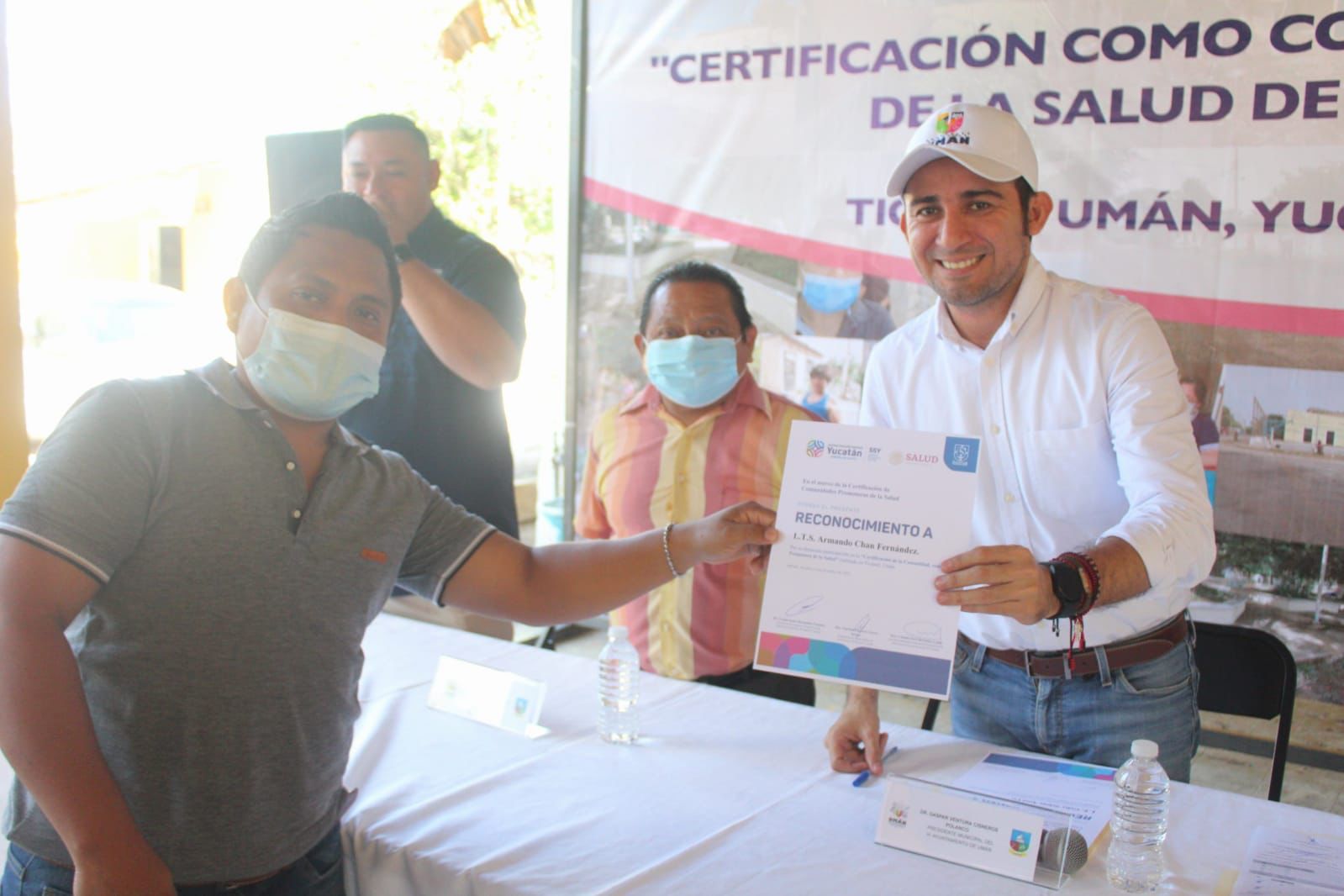 El Dr. Gaspar Ventura Cisneros Polanco, Presidente Municipal de Umán junto a autoridades Estatales de Salud develaron la placa en la comisaría de Ticimul que la certifica cómo una comunidad promotora de la Salud al igual que a las escuelas.
