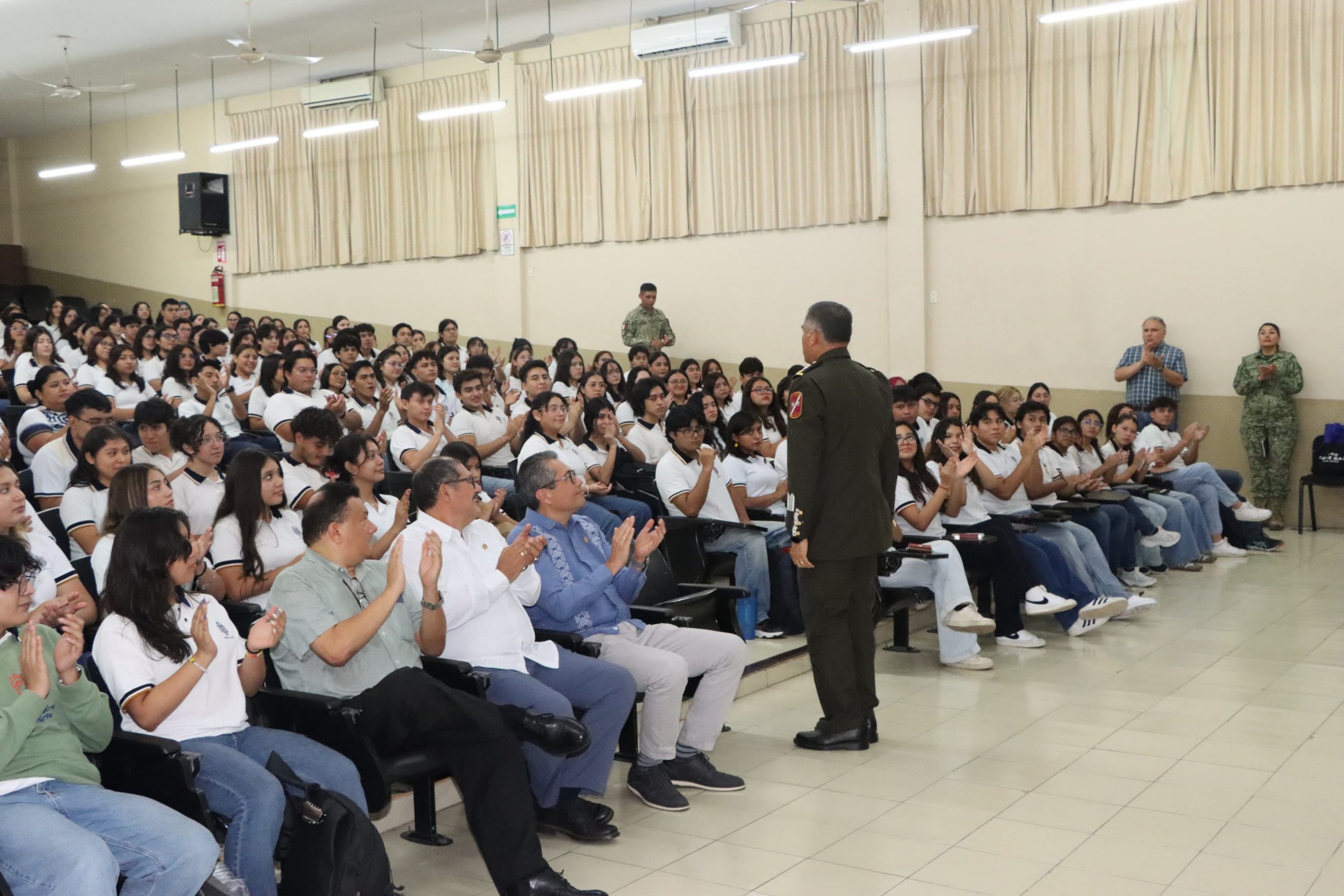 En la plática, realizada en el Auditorio de la Escuela Preparatoria, se presentaron los programas y misiones dedicadas a la protección de la población, soberanía e independencia de México por parte del Ejército Mexicano, con el objetivo de sensibilizar sobre la importancia de la seguridad nacional como compromiso compartido entre gobierno, instituciones educativas y sociedad civil.