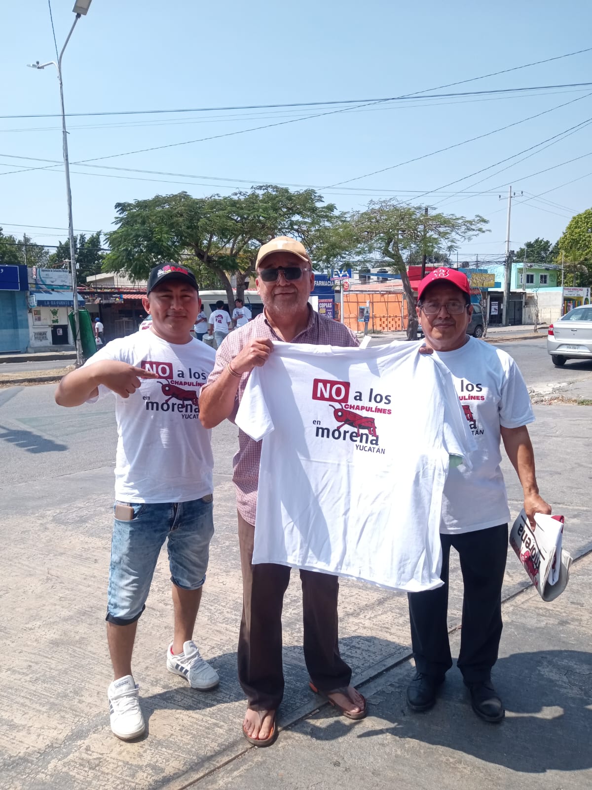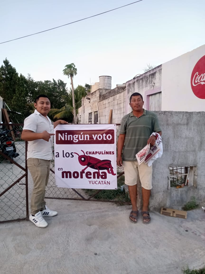 El viernes 8 realizaron un brigadeo y sostuvieron una reunión informativa en la comisaría de Chablekal; el sábado repartieron el periódico “Regeneración Yucatán” en el crucero conocido como “la Fuente Maya,” en el oriente de la ciudad; y este domingo se trasladaron al tianguis de la colonia Francisco I. Madero para continuar con el volanteo donde además distribuyeron lonas con el lema “Ni un voto a los Chapulines”.