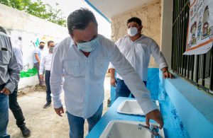 Vidal Aguilar, acompañado por representantes sindicales y del director del Instituto para el Desarrollo y Certificación de la Infraestructura Física, Educativa y Eléctrica de Yucatán (Idefeey), Luis Jorge Montalvo Duarte, visitó el preescolar indígena “Felipe Carrillo Puerto”, el jardín de niños “Narciso Bassols García” y la primaria “Jesús Reyes Heroles”, donde platicó con jefes de sector, supervisores, directores, docentes, padres de familia y el alcalde de Tecoh, Joel Achach Díaz, sobre el protocolo de regreso seguro a clases.