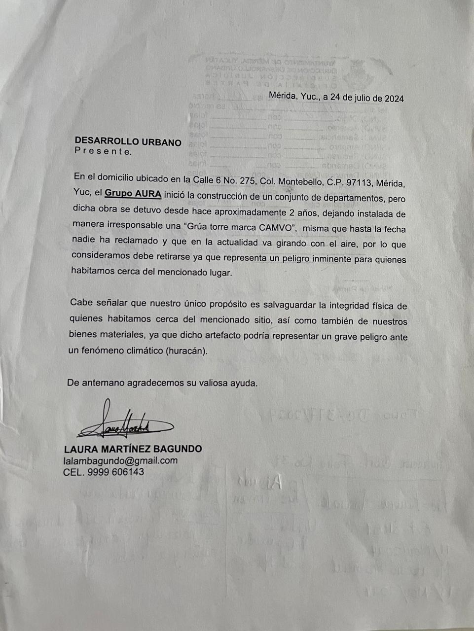 En una carta presentada ante las autoridades, la ciudadana Laura Martínez Bagundo manifiesta que en el domicilio ubicado en la calle 6 número 275 de la Colonia Montebello con código postal 97113 en la ciudad de Mérida, Yucatán, el Grupo Aura inició la construcción de un conjunto de departamentos, pero dicha obra se detuvo desde hace aproximadamente 2 años, dejando instalada de manera irresponsable una Grúa Torre Marca CAMVO, misma que hasta la fecha nadie ha reclamado y que en la actualidad va girando con el aire, por lo que consideran debe retirarse, ya que representa un peligro inminente para quienes habitan cerca del mencionado lugar.
