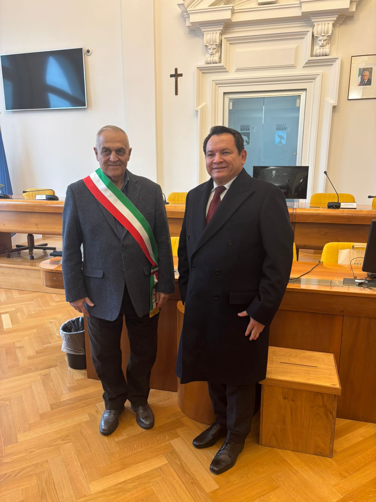Díaz Mena fue recibido por el alcalde en funciones de Monfalcone, Italia, Antonio Garritani, durante su visita al astillero de Fincantieri, uno de los más destacados del mundo.